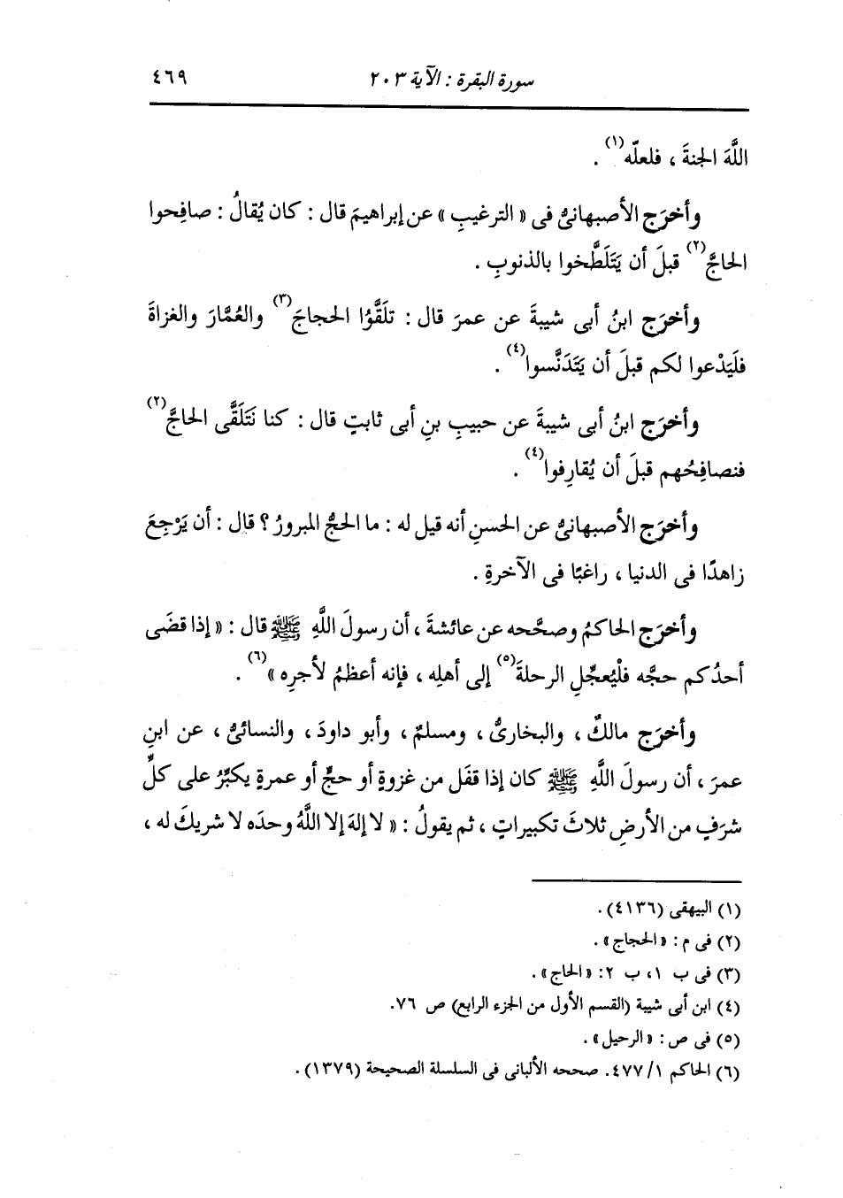 وأخرج الأصبهاني عن الحسن ، أنه قيل له ما الحج المبرور قال : أن يرجع زاهدا في الدنيا راغبا في الآخرة.