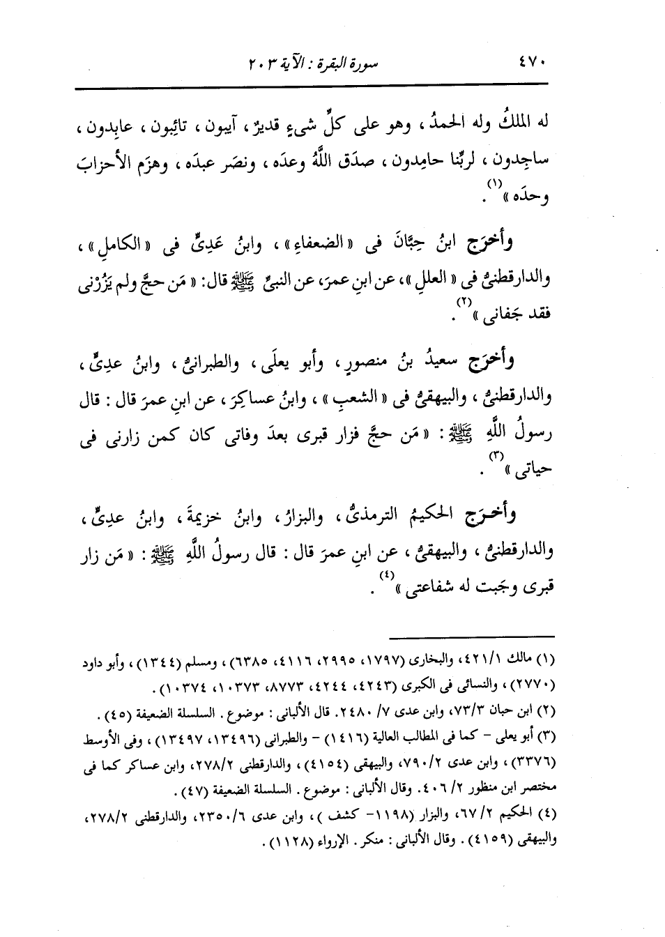 وأخرج سعيد بن منصور وأبو يعلى والطبراني ، وَابن عدي والدارقطني والبيهقي في الشعب ، وَابن عساكر عن ابن عمر قال : قال رسول الله صلى الله عليه وسلم من حج فزار قبري بعد وفاتي كان كم زارني في حياتي.