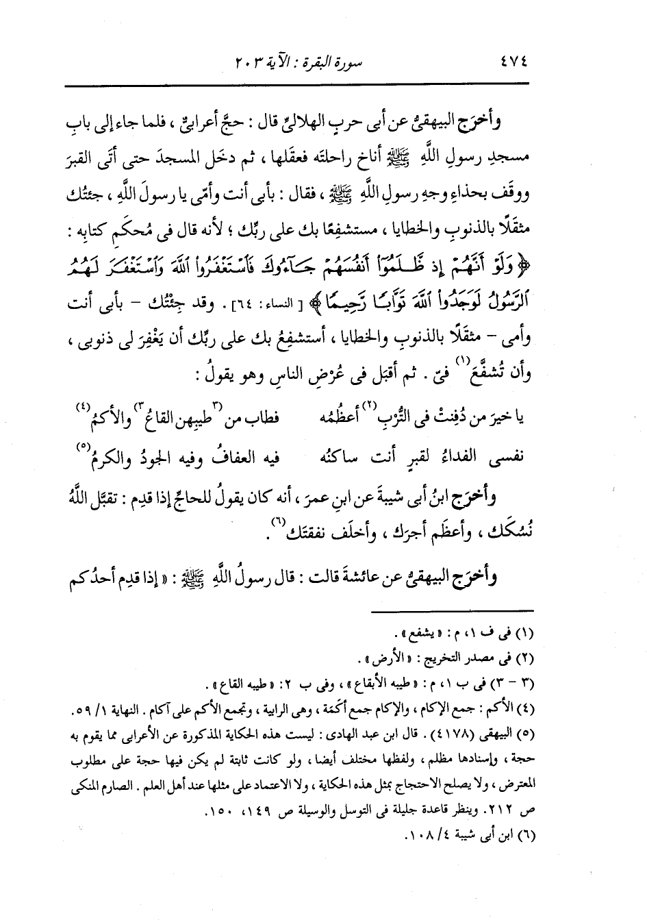 وأخرج البيهقي عن أبي حرب الهلالي قال : حج أعرابي إلى باب مسجد رسول الله صلى الله عليه وسلم أناخ راحلته فعقلها ثم دخل المسجد حتى أتى القبر ووقف بحذاء وجه رسول الله صلى الله عليه وسلم فقال : بأبي أنت وأمي يا رسول الله جئتك مثقلا بالذنوب والخطايا مستشفعا بك على ربك لأنه قال في محكم تنزيله (ولو أنهم إذ ظلموا أنفسهم جاؤوك فاستغفروا الله واستغفر لهم الرسول لوجدوا الله توابا رحيما) (النساء الآية 64).