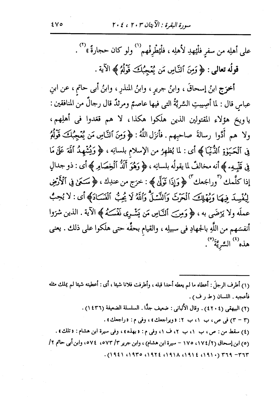 أخرج ابن إسحاق ، وَابن جَرِير ، وَابن المنذر ، وَابن أبي حاتم عن ابن عباس قال : لما أصيبت السرية التي فيها عاصم ومرثد قال رجال من المنافقين : يا ويح هؤلاء المقتولين الذين هلكوا هكذا لا هم قعدوا في أهلهم ولا هم أدوا رسالة صاحبهم فأنزل الله {ومن الناس من يعجبك قوله في الحياة الدنيا} أي لما يظهر من الإسلام بلسانه {ويشهد الله على ما في قلبه} أنه مخالف لما يقوله بلسانه {وهو ألد الخصام} أي ذو جدال إذا كلمك راجعك (وإذا تولى) خرج من عندك (سعى في الأرض ليفسد فيها ويهلك الحرث والنسل والله لا يحب الفساد) (البقرة الآية 205) أي لا يحب عمله ولا يرضى به (ومن الناس من يشري نفسه) (البقرة الآية 207) الآية ، الذين شروا أنفسهم من الله بالجهاد في سبيله والقيام بحقه حتى هلكوا في ذلك يعني بهذه السرية