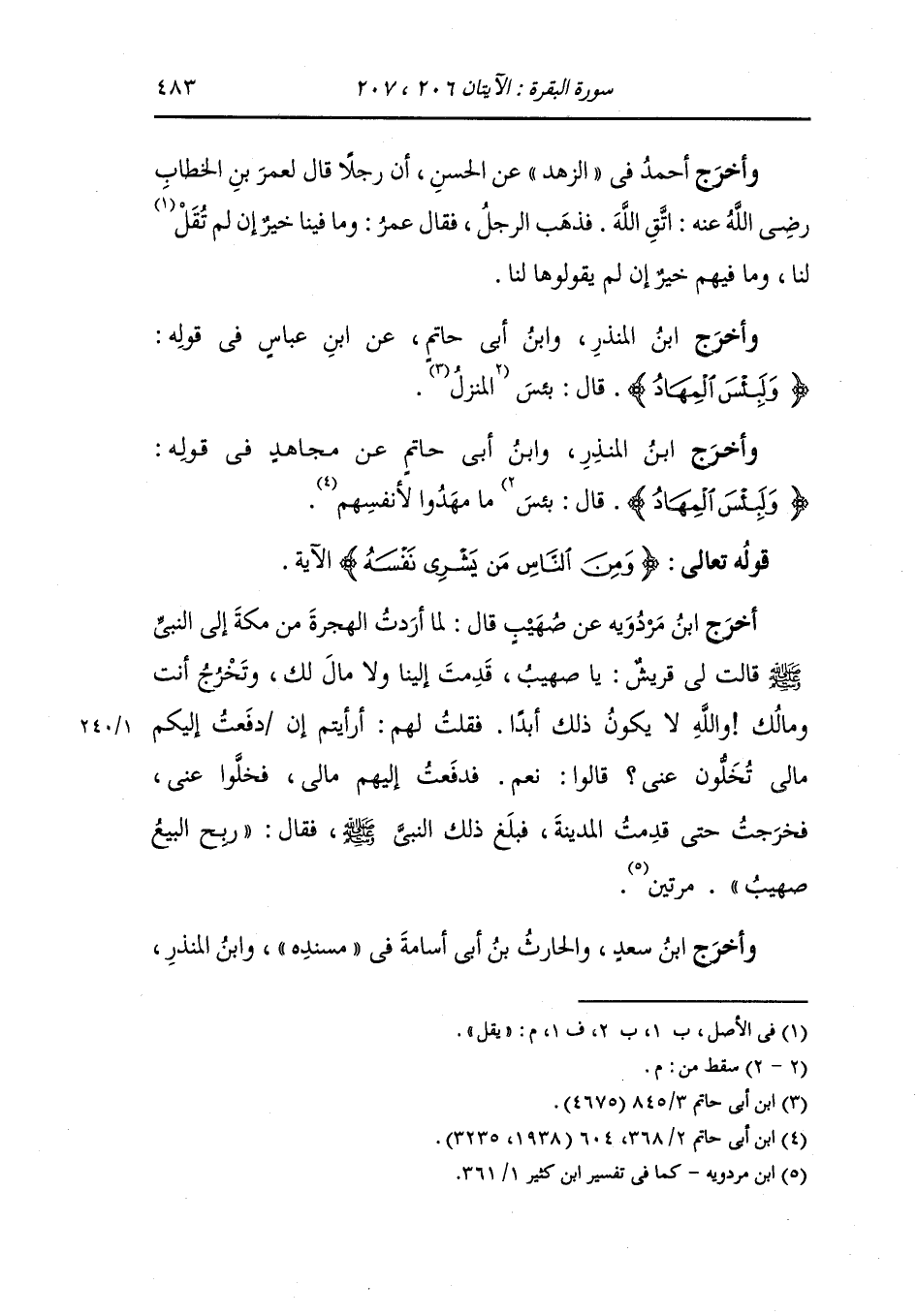أخرج ابن مردويه عن صهيب قال لما أردت الهجرة من مكة إلى النَّبِيّ صلى الله عليه وسلم قالت لي قريش : يا صهيب قدمت إلينا ولا مال لك وتخرج أنت ومالك والله لا يكون ذلك أبدا فقلت لهم : أرأيتم إن دفعت لكم مالي تخلون عني قالوا : نعم ، فدفعت إليهم مالي فخلوا عني فخرجت حتى قدمت المدينة فبلغ ذلك النَّبِيّ صلى الله عليه وسلم فقال : ربح البيع صهيب مرتين.