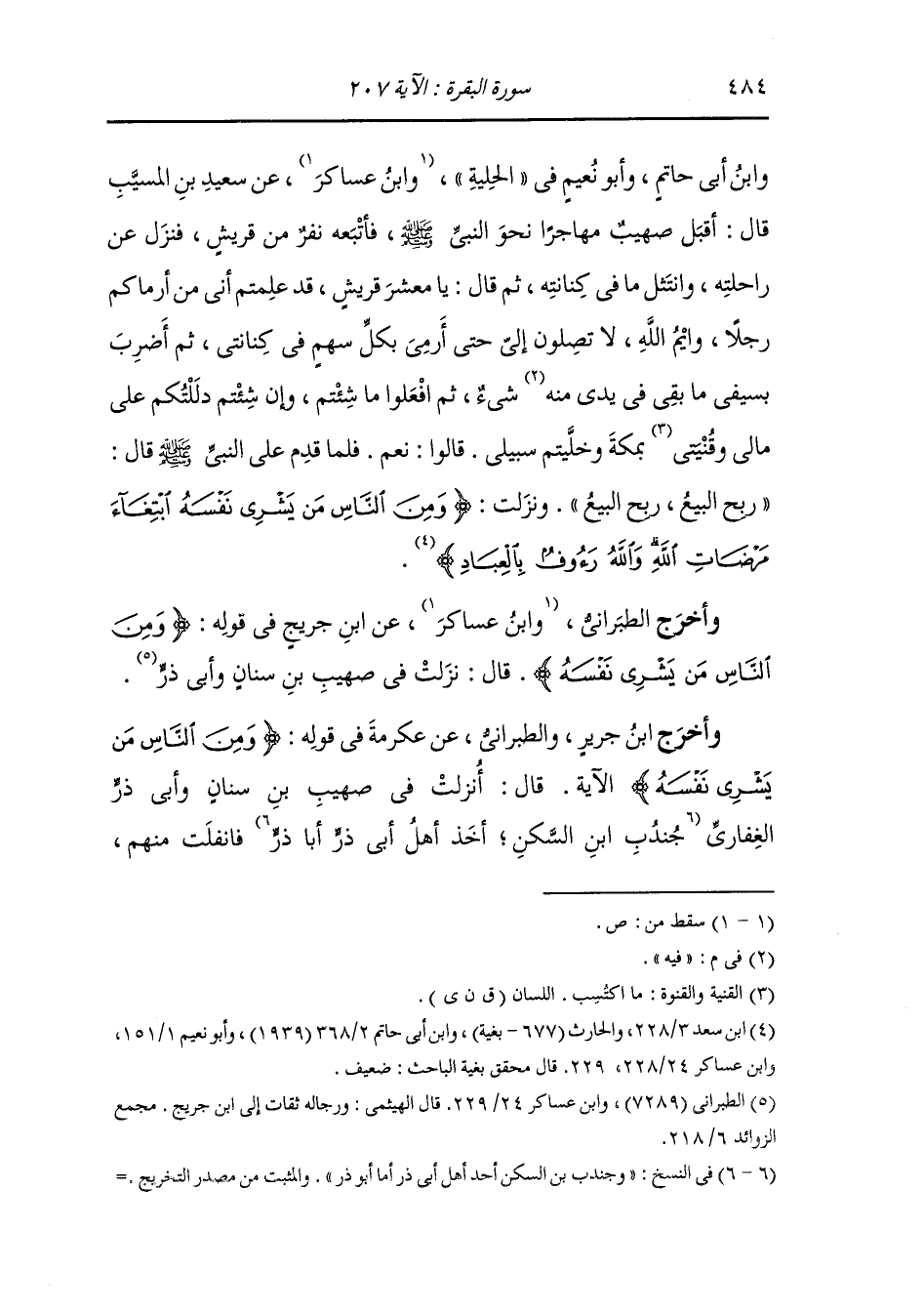 وأبو نعيم في الحلية ، وَابن عساكر عن سعيد بن المسيب قال أقبل صهيب مهاجرا نحو النَّبِيّ صلى الله عليه وسلم فاتبعه نفر من قريش فنزل عن راحلته وانتثل ما في كنانته ثم قال : يا معشر قريش قد علمتم أني من أرماكم رجلا وأيم الله لا تصلون إلي حتى أرمي بكل سهم في كنانتي ثم أضرب بسيفي ما بقي في يدي فيه شيء ثم افعلوا ما شئتم وإن شئتم دللتكم على مالي وقنيتي بمكة وخليتم سبيلي ، قالوا : نعم ، فلما قدم على النَّبِيّ صلى الله عليه وسلم قال : ربح البيع ربح البيع ، ونزلت {ومن الناس من يشري نفسه ابتغاء مرضات الله والله رؤوف بالعباد}.
