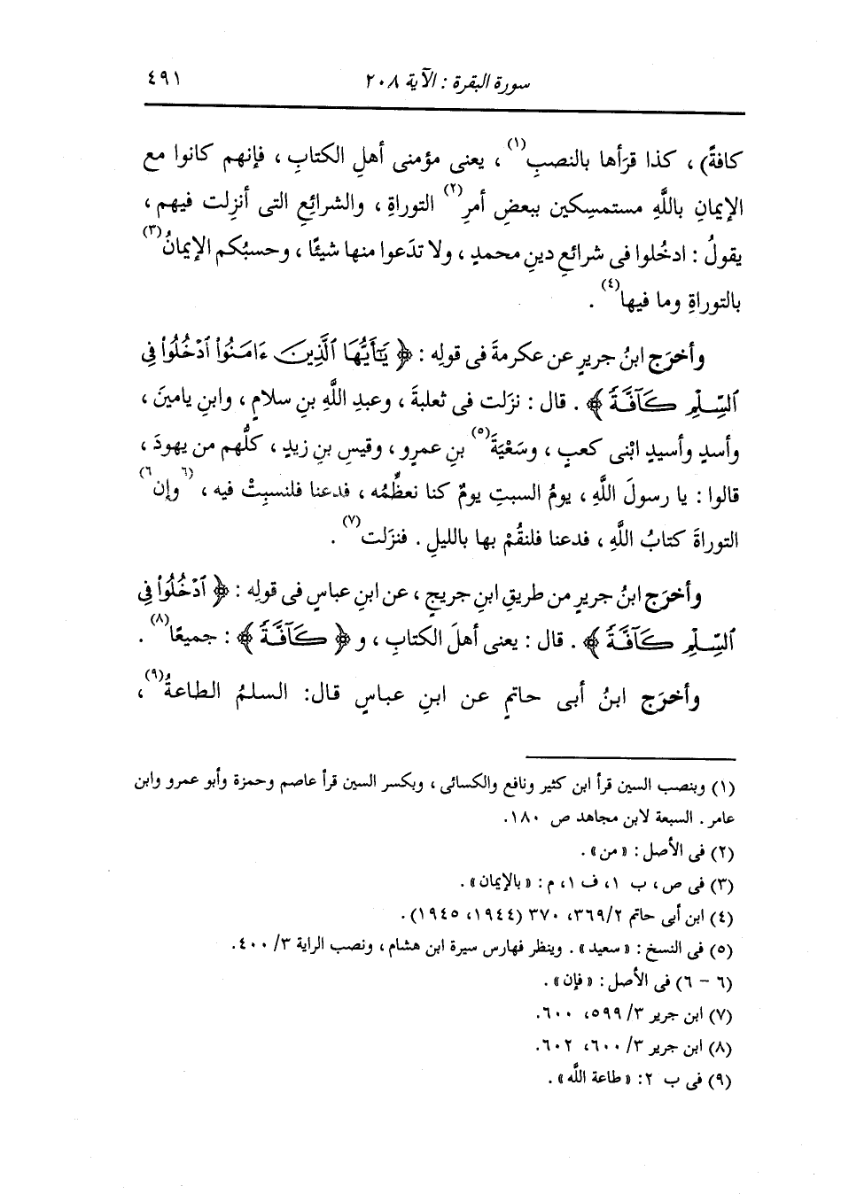وأخرج ابن جرير من طريق ابن جريج عن ابن عباس في قوله {ادخلوا في السلم} قال : يعني أهل الكتاب و{كافة} : جميعا.