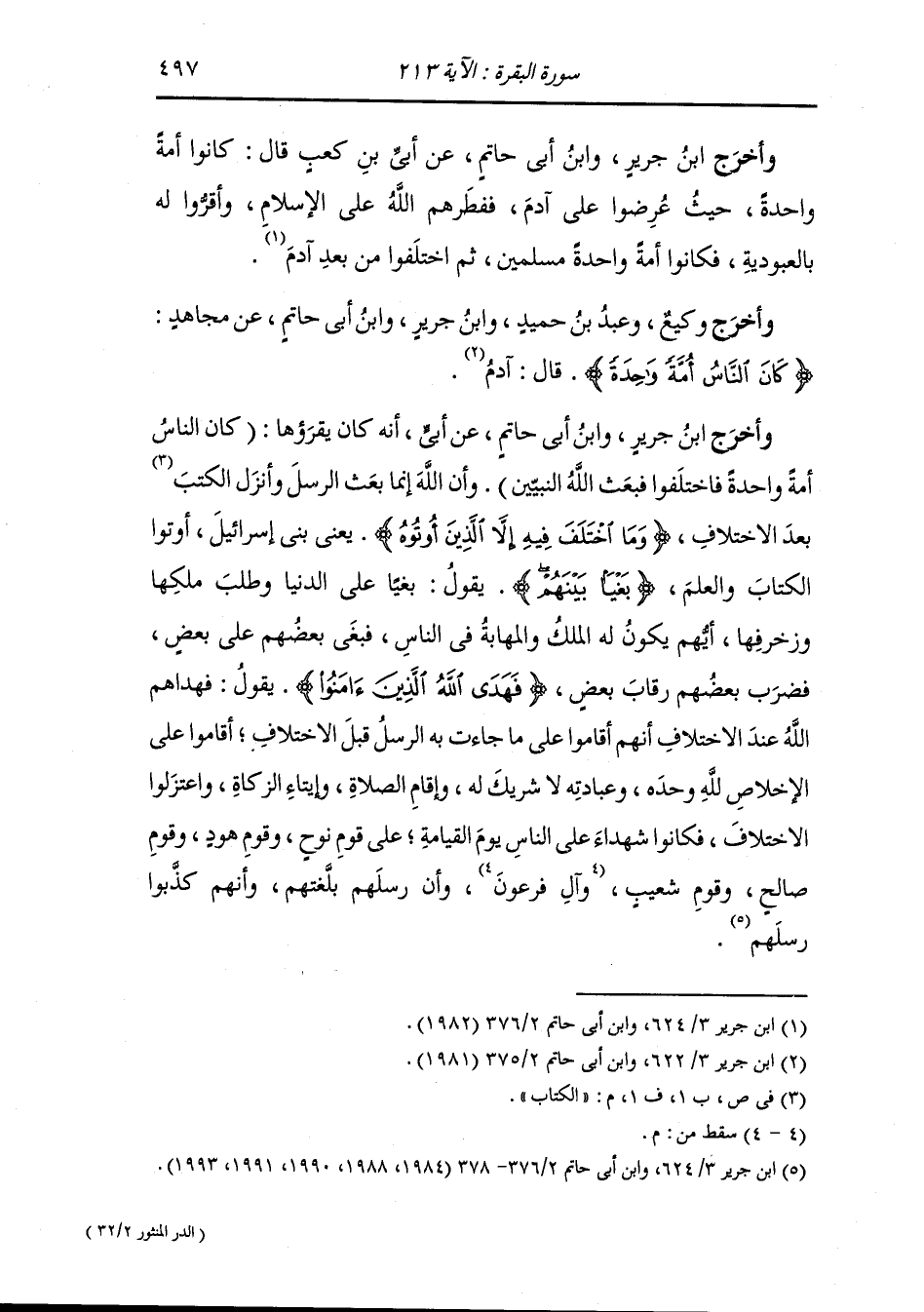 وأخرج ابن جرير ، وَابن أبي حاتم عن أبي أنه كان يقرؤها / {كان الناس أمة واحدة فاختلفوا فبعث الله النبيين > / وإن الله إنما بعث الرسل وأنزل الكتاب بعد الاختلاف {وما اختلف فيه إلا الذين أوتوه} يعني بني اسرائيل أوتوا الكتاب والعلم {بغيا بينهم} يقول : بغيا على الدنيا وطلب ملكها وزخرفها أيهم يكون له الملك والمهابة في الناس فبغى بعضهم على بعض فضرب بعضهم رقاب بعض {فهدى الله الذين آمنوا} يقول : فهداهم الله عند الاختلاف أنهم أقاموا على ما جاءت به الرسل قبل الاختلاف أقاموا على الإخلاص لله وحده وعبادته لا شريك له وإقام الصلاة وإيتاء الزكاة واعتزلوا الاختلاف فكانوا شهداء على الناس يوم القيامة على قوم نوح وقوم هود وقوم صالح وقوم شعيب وآل فرعون وأن رسلهم بلغتهم وأنهم كذبوا رسلهم