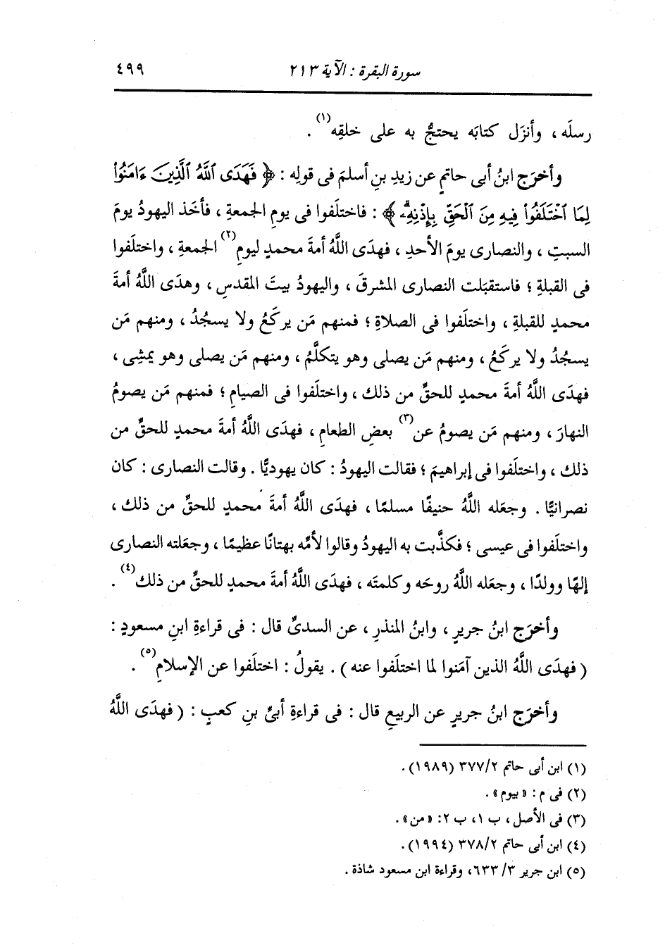 وأخرج ابن أبي حاتم عن زيد بن أسلم في قوله {فهدى الله الذين آمنوا لما اختلفوا فيه من الحق بإذنه} فاختلفوا في يوم الجمعة فأخذ اليهود يوم السبت والنصارى يوم الأحد فهدى الله أمة محمد بيوم الجمعة واختلفوا في القبلة فاستقبلت النصارى المشرق واليهود بيت المقدس وهدى الله أمة محمد للقبلة واختلفوا في الصلاة فمنهم من يركع ولا يسجد ومنهم من يسجد ولا يركع ومنهم من يصلي وهو يتكلم ومنهم من يصلي وهو يمشي فهدى الله أمة محمد للحق من ذلك واختلفوا في الصيام فمنهم من يصوم النهار ومنهم من يصوم عن بعض الطعام فهدى الله أمة محمد للحق من ذلك ، واختلفوا في إبراهيم فقالت اليهود : كان يهوديا وقالت النصارى : كان نصرانيا ، وجعله الله حنيفا مسلما فهدى الله أمة محمد للحق من ذلك ، واختلفوا في عيسى فكذبت به اليهود وقالوا لأمه بهتانا عظيما وجعلته النصارى إلها وولدا وجعله الله روحه وكلمته فهدى الله أمة محمد للحق من ذلك.