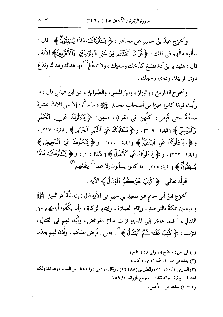 وأخرج الدارمي والبزار ، وَابن المنذر والطبراني عن ابن عباس قال : ما رأيت قوما كانوا خيرا من أصحاب رسول الله صلى الله عليه وسلم ما سألوه إلا عن ثلاث عشرة مسألة حتى قبض كلهن في القرآن منهن (يسألونك عن الخمر والميسر) (البقرة الآية 219) و(يسألونك عن الشهر الحرام) (البقرة الآية 217) و(يسالونك عن اليتامى) (البقرة الآية 220) و(يسألونك عن المحيض) (البقرة الآية 222) و(يسألونك عن الأنفال) (الأنفال الآية 1) و{يسألونك ماذا ينفقون} ما كانوا يسألونك إلا عما كان ينفعهم.