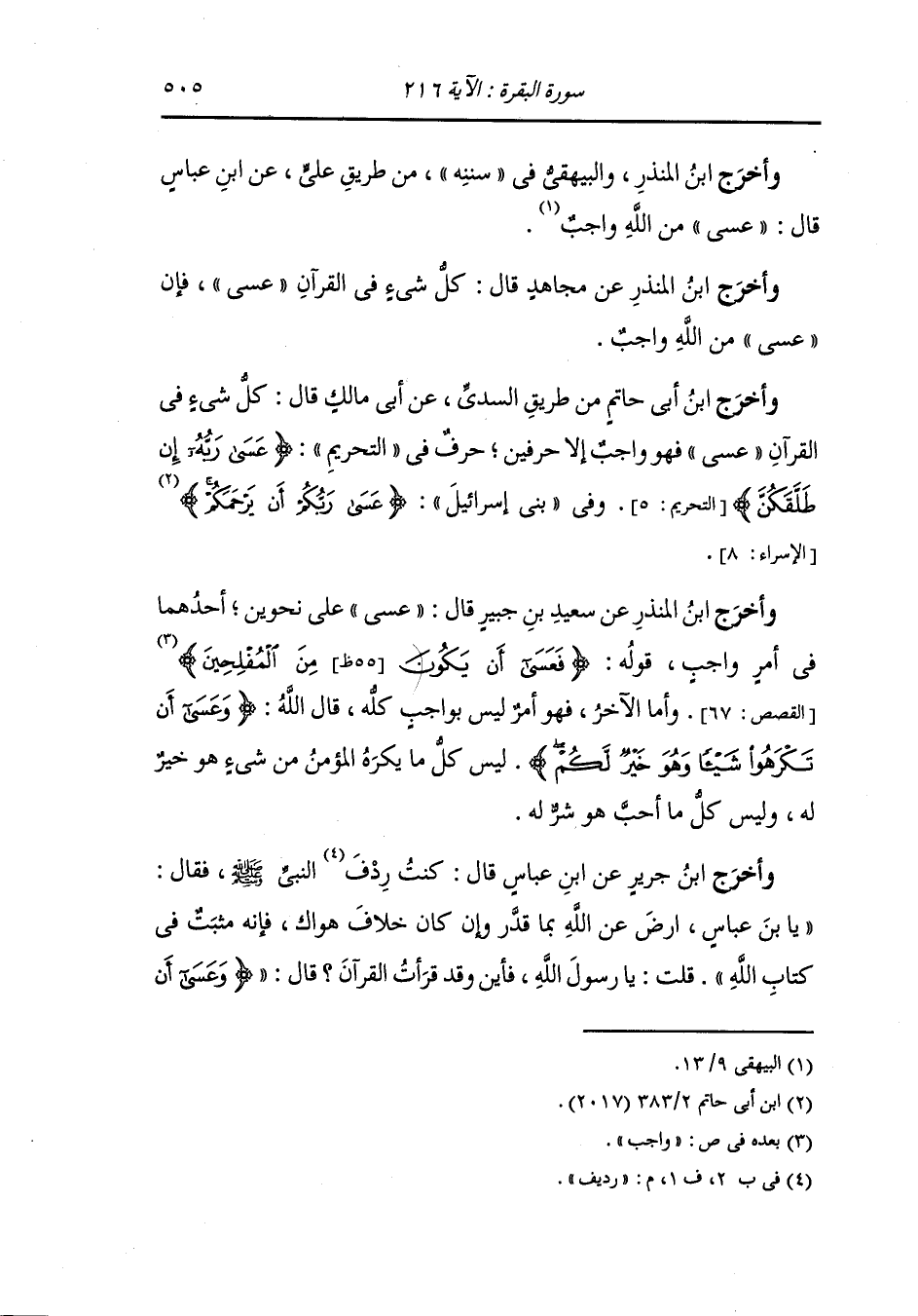وأخرج ابن المنذر عن سعيد بن جبير قال : عسى على نحوين : أحدهما في أمر واجب قوله (فعسى أن يكون من المفلحين) (القصص الآية 67) وأما الآخر فهو أمر ليس واجب كله قال الله {وعسى أن تكرهوا شيئا وهو خير لكم} ليس كل ما يكره المؤمن من شيء هو خير له وليس كل ما أحب هو شر له.