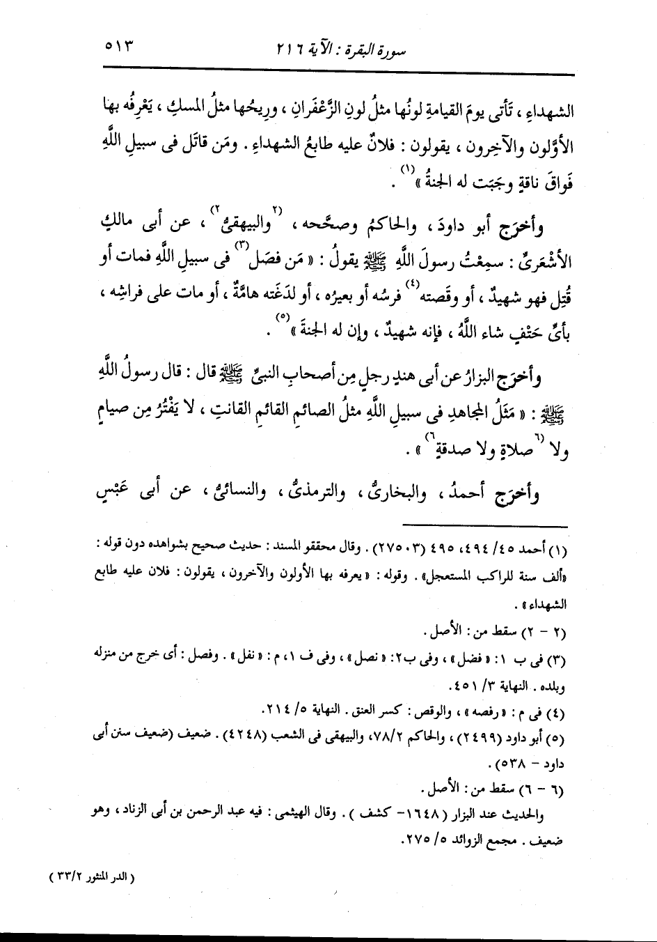 الشهداء تأتي يوم القيامة لونها مثل لون الزعفران وريحها مثل المسك يعرفه بها الأولون والآخرون يقولون : فلان عليه طابع الشهداء ، ومن قاتل في سبيل الله فواق ناقة وجبت له الجنة.