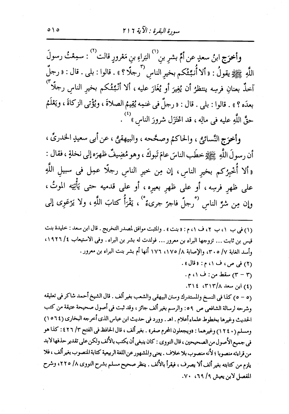 وأخرج ابن سعد عن أم بشر بنت البراء بن معرور قالت : سمعت رسول الله صلى الله عليه وسلم يقول ألا أنبئكم بخير الناس بعده قالوا : بلى ، قال : رجل في غنمه يقيم الصلاة ويؤتي الزكاة يعلم حق الله في ماله قد اعتزل شرور الناس.