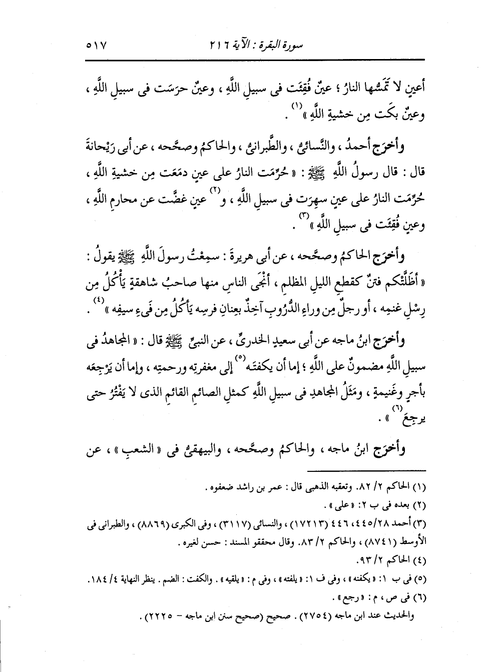 وأخرج أحمد والنسائي والطبراني والحاكم وصححه عن أبي ريحانة قال : قال رسول الله صلى الله عليه وسلم حرمت النار على عين دمعت من خشية الله حرمت النار على عين سهرت في سبيل الله وعين غضت عن محارم الله وعين فقئت في سبيل الله.