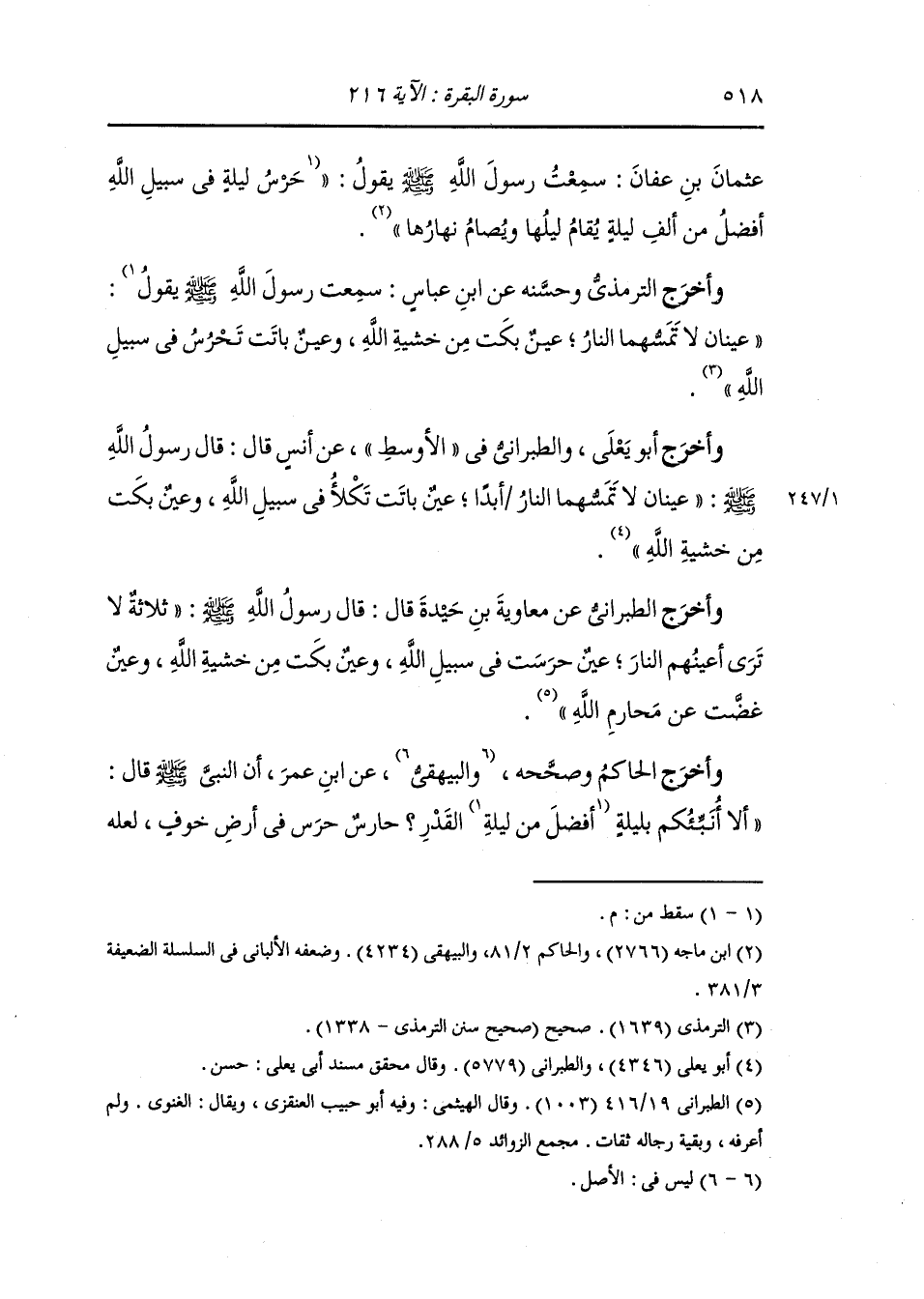 وأخرج الطبراني عن معاوية بن حيدة قال : قال رسول الله صلى الله عليه وسلم ثلاثة لا ترى أعينهم النار : عين حرست في سبيل الله وعين بكت من خشية الله وعين غضت عن محارم الله.