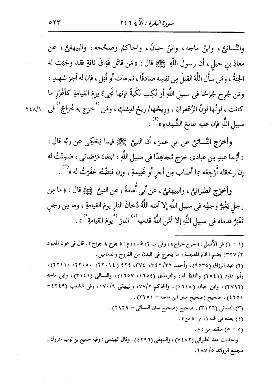 وأخرج الطبراني والبيهقي عن أبي أمامة أن النَّبِيّ صلى الله عليه وسلم قال : ما من رجل يغبر وجهه في سبيل الله إلا آمنه الله دخان النار يوم القيامة وما من رجل تغبر قدماه في سبيل الله إلا أمن الله قدميه من النار