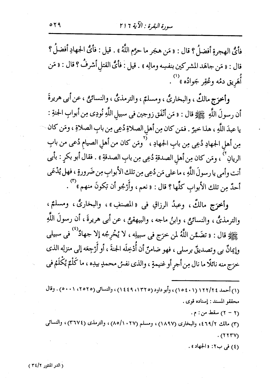 وأخرج مالك وعبد الرزاق في المصنف والبخاري ومسلم والترمذي والنسائي ، وَابن ماجة والبيهقي عن أبي هريرة أن رسول الله صلى الله عليه وسلم قال : تضمن الله لمن خرج في سبيله لا يخرجه إلا جهاد في سبيلي وإيمان بي وتصديق برسلي فهو ضامن أن أدخلته الجنة أو أرجعه إلى منزله الذي خرج منه نائلا ما نال من أجر أو غنيمة والذي نفس محمد بيده ما كلم بكلم في