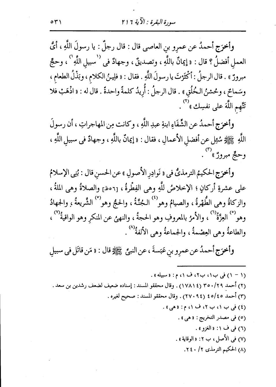 وأخرج أحمد عن عمرو بن عبسة عن النَّبِيّ صلى الله عليه وسلم قال من قاتل في سبيل