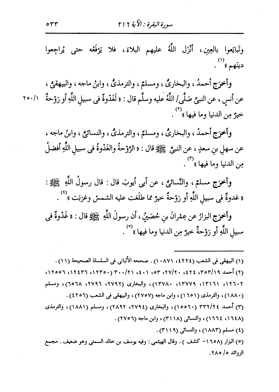 وأخرج أحمد والبخاري ومسلم والترمذي ، وَابن ماجة والبيهقي عن أنس عن النَّبِيّ صلى الله عليه وسلم قال لغدوة في سبيل الله أو روحة خير من الدنيا وما فيها.