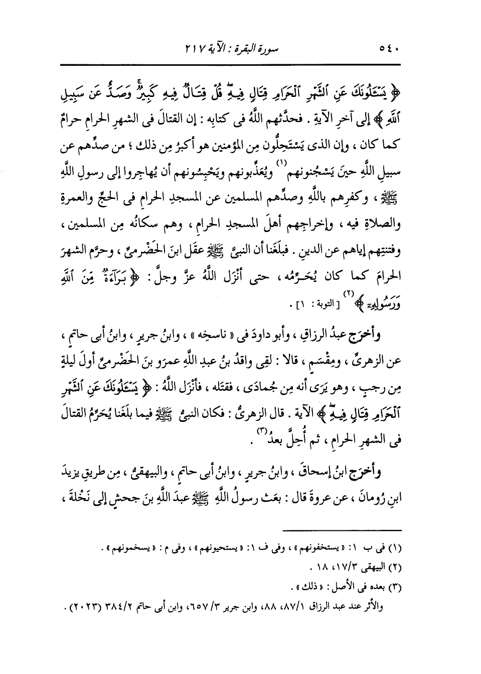{يسألونك عن الشهر الحرام قتال فيه قل قتال فيه كبير وصد عن سبيل الله} إلى آخر الآية ، فحدثهم الله في كتابه : إن القتال في الشهر الحرام حرام كما كان وإن الذين يستحلون من المؤمنين هو أكبر من ذلك فمن صدهم عن سبيل الله حين يسخمونهم ويعذبونهم ويحبسونهم أن يهاجروا إلى رسول الله صلى الله عليه وسلم وكفرهم بالله وصدهم للمسلمين عن المسجد الحرام في الحج والعمرة والصلاة فيه وإخراجهم أهل المسجد الحرام وهم سكانه من المسلمين وفتنهم إياهم عن الدين فبلغنا أن النَّبِيّ صلى الله عليه وسلم عقل ابن الحضرمي وحرم الشهر الحرام كما كان يحرمه حتى أنزل الله عز وجل (براءة من الله ورسوله) (التوبة الآية 1).