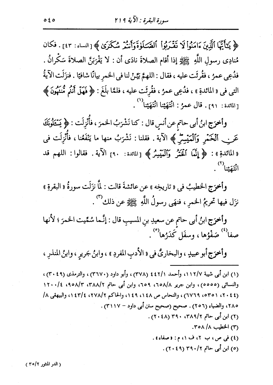 وأخرج ابن أبي حاتم عن أنس قال : كنا نشرب الخمر فأنزلت {يسألونك عن الخمر والميسر} الآية ، فقلنا : نشرب منها ما ينفعنا ، فأنزلت في المائدة (إنما الخمر والميسر) (المائدة الآية 90) ، الآية ، فقالوا : اللهم قد انتهينا.