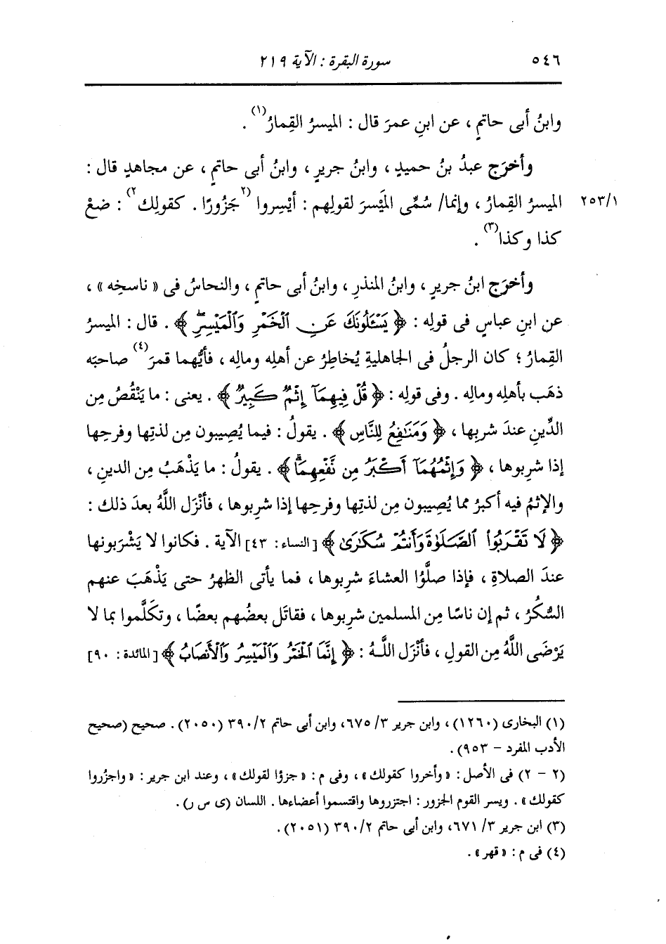 وأخرج ابن جرير ، وَابن المنذر ، وَابن أبي حاتم والنحاس في ناسخه عن ابن عباس في قوله {يسألونك عن الخمر والميسر} قال : الميسر القمار كان الرجل في الجاهلية يخاطر عن أهله وماله فأيهما قهر صاحبه ذهب بأهله وماله ، وفي قوله {قل فيهما إثم كبير} يعني ما ينقص من الدين عند شربها {ومنافع للناس} يقول : فيما يصيبون من لذتها وفرحها إذا شربوها {وإثمهما أكبر من نفعهما} يقول : ما يذهب من الدين والإثم فيه أكبر مما يصيبون من لذتها وفرحها إذا شربوها فأنزل الله بعد ذلك (لا تقربوا الصلاة وأنتم سكارى) (النساء الآية 43) الآية ، فكانوا لا يشربونها عند الصلاة فإذا صلوا العشاء شربوها فما يأتي الظهر حتى يذهب عنهم السكر ثم إن ناسا من المسلمين شربوها فقاتل بعضهم بعضا وتكلموا بما لا يرضي الله من القول ، فأنزل الله (إنما الخمر والميسر والأنصاب) (المائدة الآية 90)