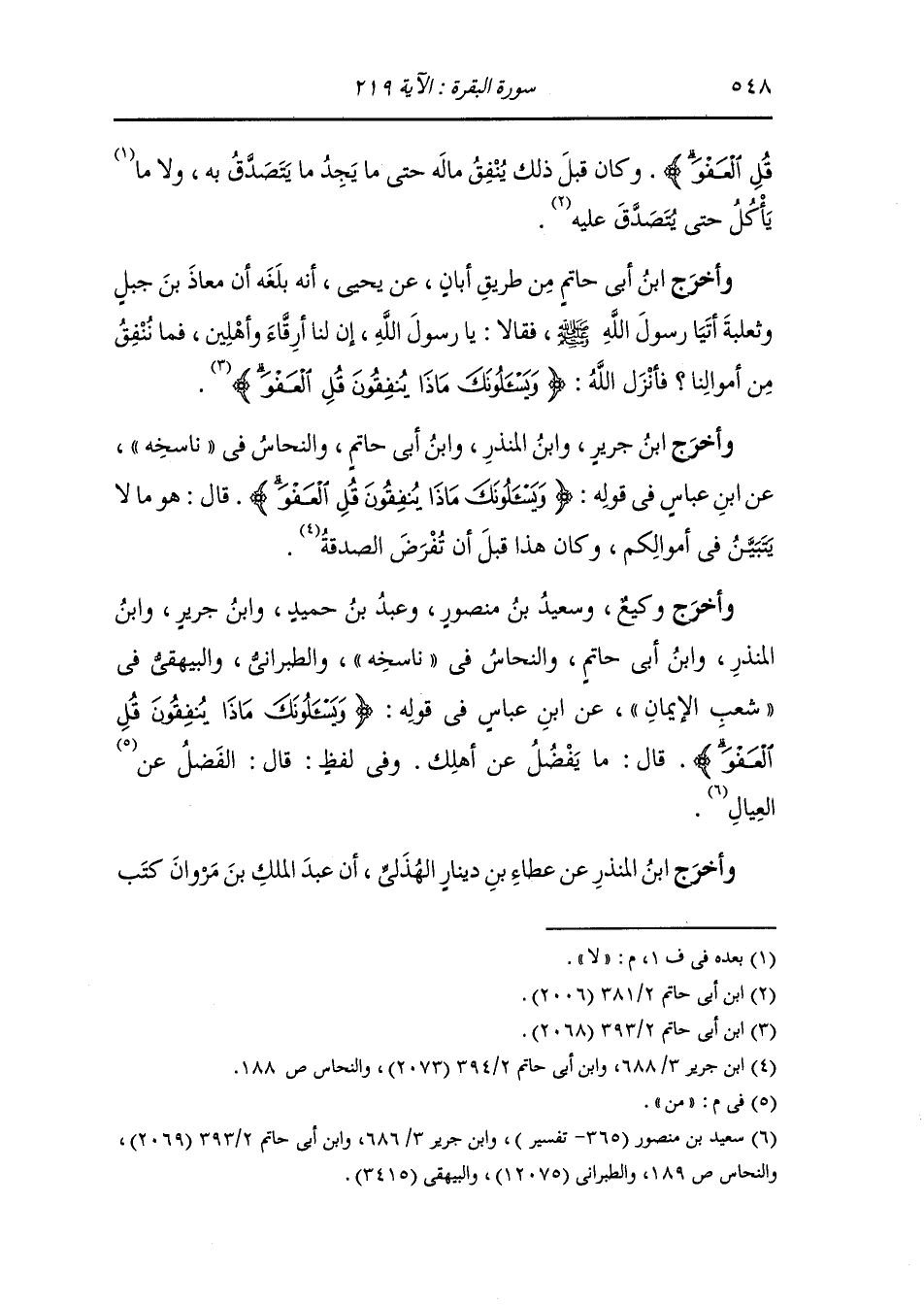 وأخرج ابن جرير ، وَابن المنذر ، وَابن أبي حاتم والنحاس في ناسخه عن ابن عباس في قوله {ويسألونك ماذا ينفقون قل العفو} قال : هو ما لا يتبين في أموالكم وكان هذا قبل أن تفرض الصدقة.