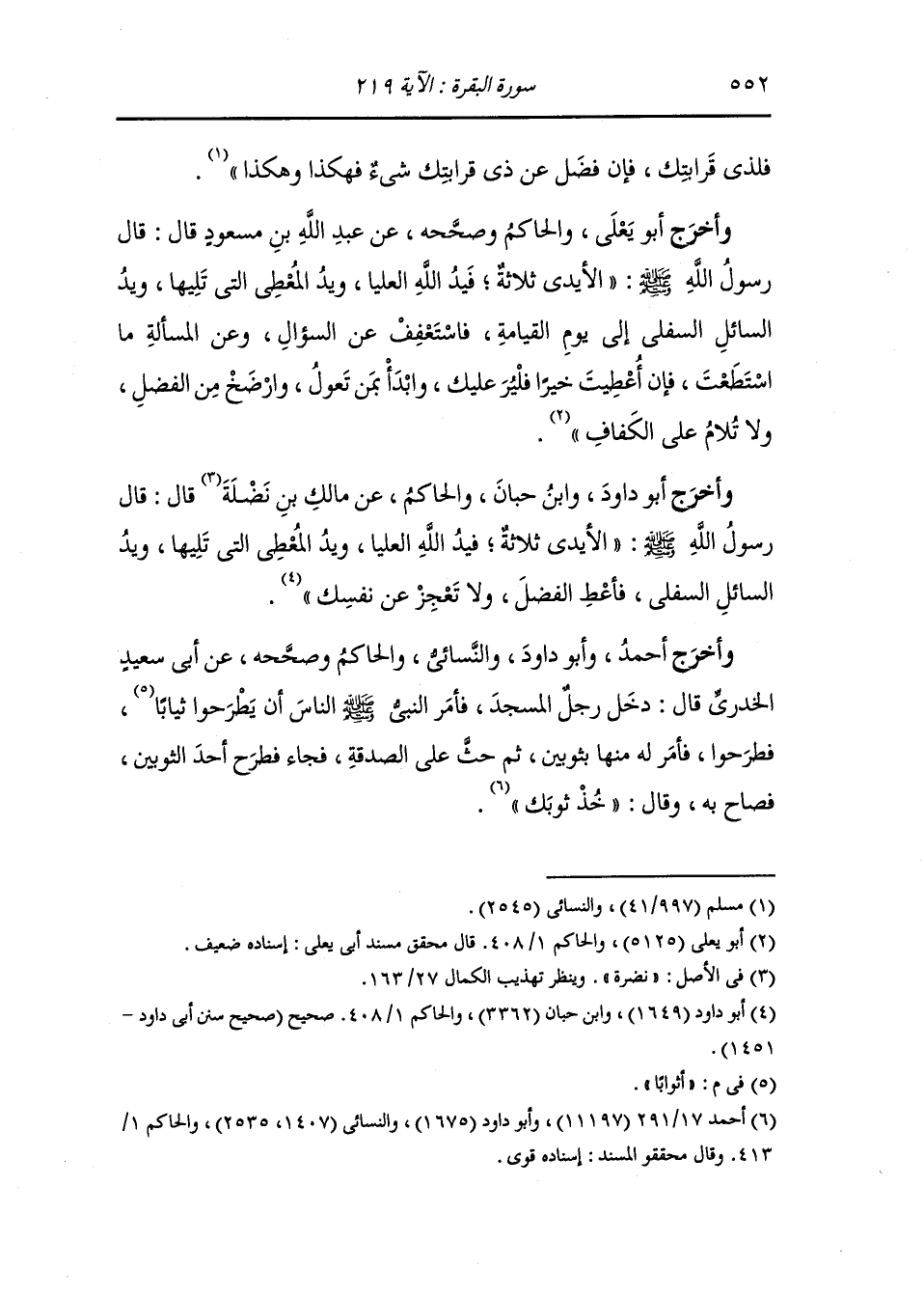 وأخرج أبو داود ، وَابن حبان والحاكم عن مالك بن نضلة قال : قال رسول الله صلى الله عليه وسلم الأيدي ثلاث ، فيد الله العليا ويد المعطي التي تليها ويد السائل السفلى فأعط الفضل ولا تعجز عن نفسك.