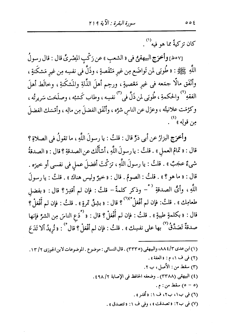 وأخرج البزار عن أبي ذر قال : قلت يا رسول الله ما تقول في الصلاة قال : تمام العمل ، قلت : يا رسول الله أسألك عن الصدقة قال : شيء عجيب قلت : يا رسول الله تركت أفضل عمل في نفسي أو خيره قال : ما هو قلت : الصوم ، قال : خير وليس هناك ، قلت : يا رسول الله وأي الصدقة قال : تمرة ، قلت : فإن لم أفعل قال : بكلمة طيبة ، قلت : فإن لم أفعل قال : تريد أن لا تدع