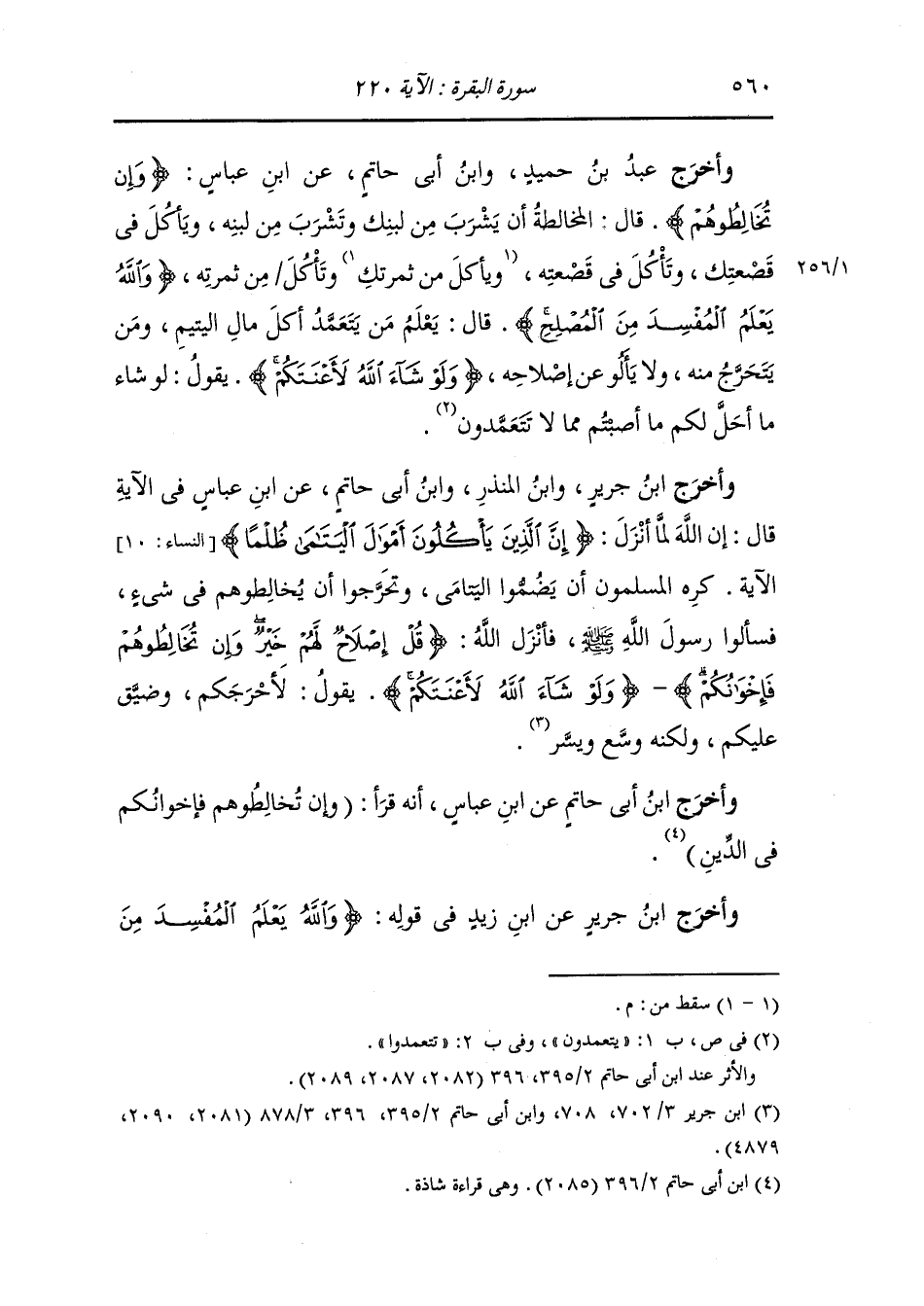 وأخرج عَبد بن حُمَيد ، وَابن أبي حاتم عن ابن عباس {وإن تخالطوهم} قال : المخالطة أن يشرب من لبنك وتشرب من لبنه ويأكل في قصعتك وتأكل في قصعته وتأكل من ثمرته {والله يعلم المفسد من المصلح} قال : يعلم من يتعمد أكل مال اليتيم ومن يتحرج منه ولا يألو عن إصلاحه {ولو شاء الله لأعنتكم} يقول : لو شاء ما أحل لكم ما أصبتم مما لا تتعمدون.