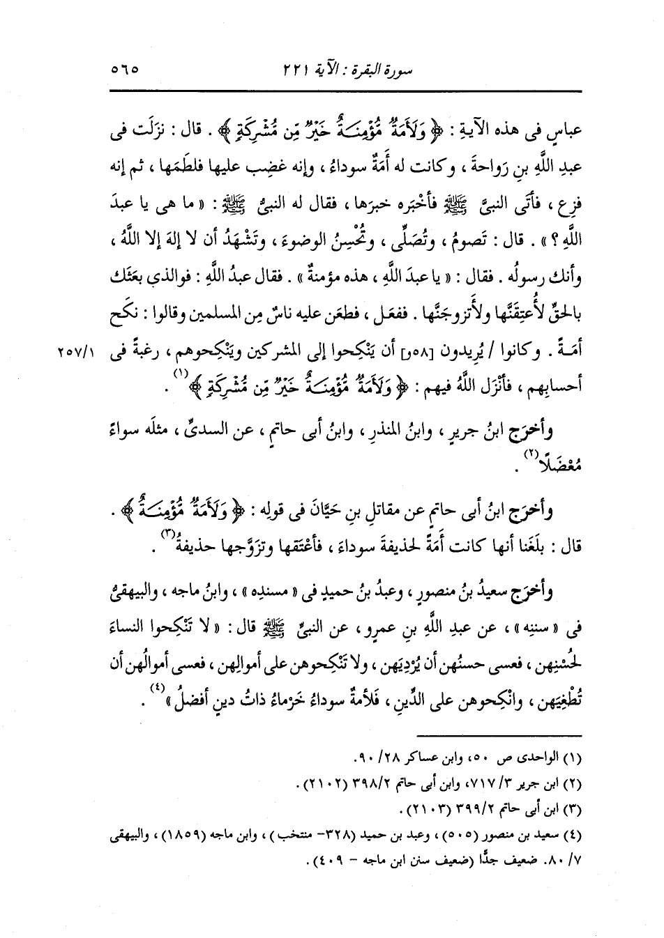 عباس في هذه الآية {ولأمة مؤمنة خير من مشركة} قال نزلت في عبد الله بن رواحة وكانت له أمة سوداء وأنه غضب عليها فلطمها ثم إنه فزع فأتى النَّبِيّ صلى الله عليه وسلم فأخبره خبرها ، فقال له النَّبِيّ صلى الله عليه وسلم : ما هي يا عبد الله قال : تصوم وتصلي وتحسن الوضوء وتشهد أن لا إله إلا الله وأنك رسوله ، فقال : يا عبد الله هذه مؤمنة ، فقال عبد الله : فوالذي بعثك بالحق لأعتقها ولأتزوجها ففعل فطعن عليه ناس من المسلمين وقالوا : نكح أمة وكانوا يريدون أن ينكحوا إلى المشركين وينكحوهم رغبة في أحسابهم فأنزل الله {ولأمة مؤمنة خير من مشركة}.