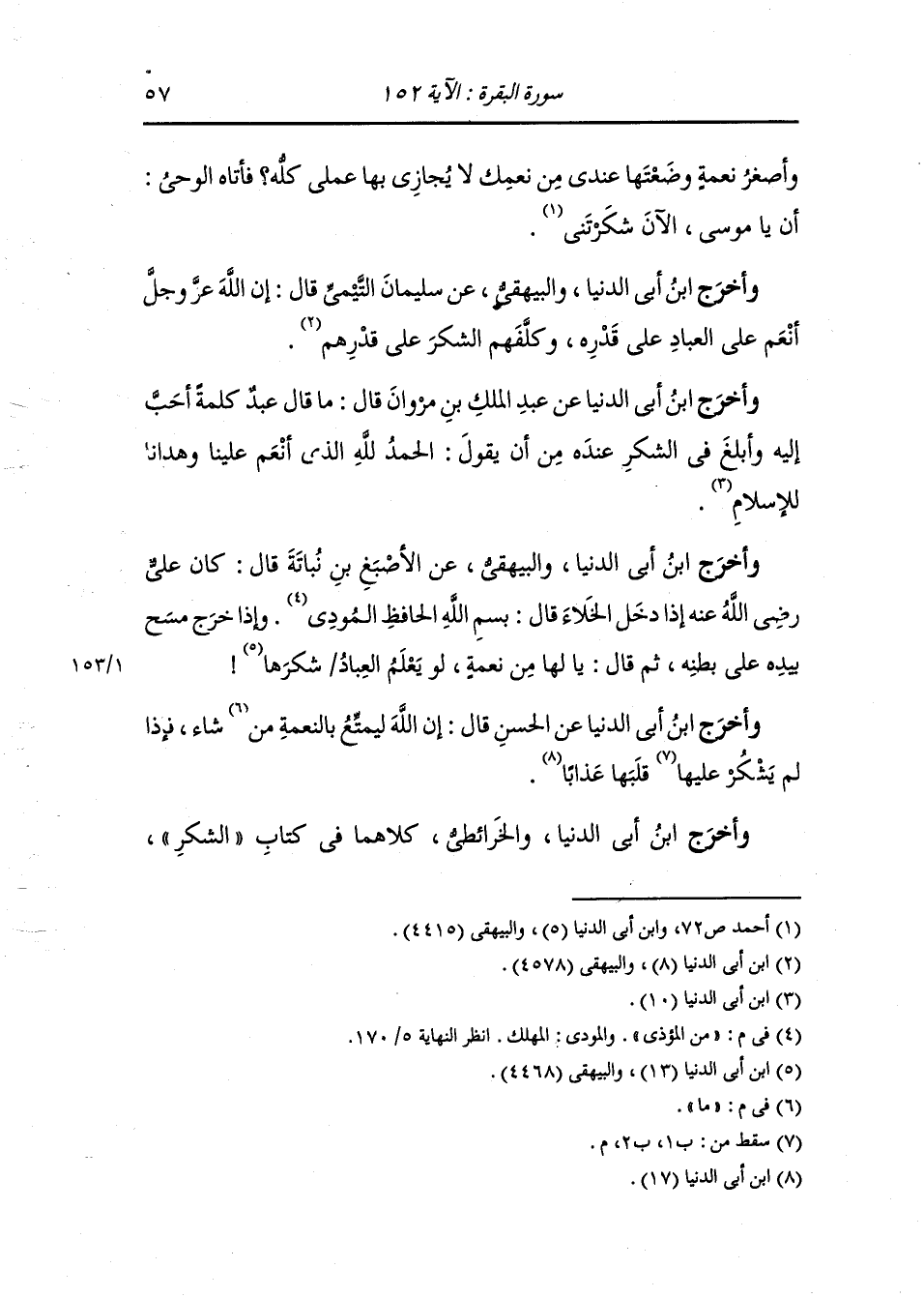 وأخرج أحمد في الزهد ، وَابن أبي الدنيا والبيهقي عن أبي الجلد قال : قرأت في مساءلة موسى عليه السلام ، أنه قال : يا رب كيف لي أن أشكرك
