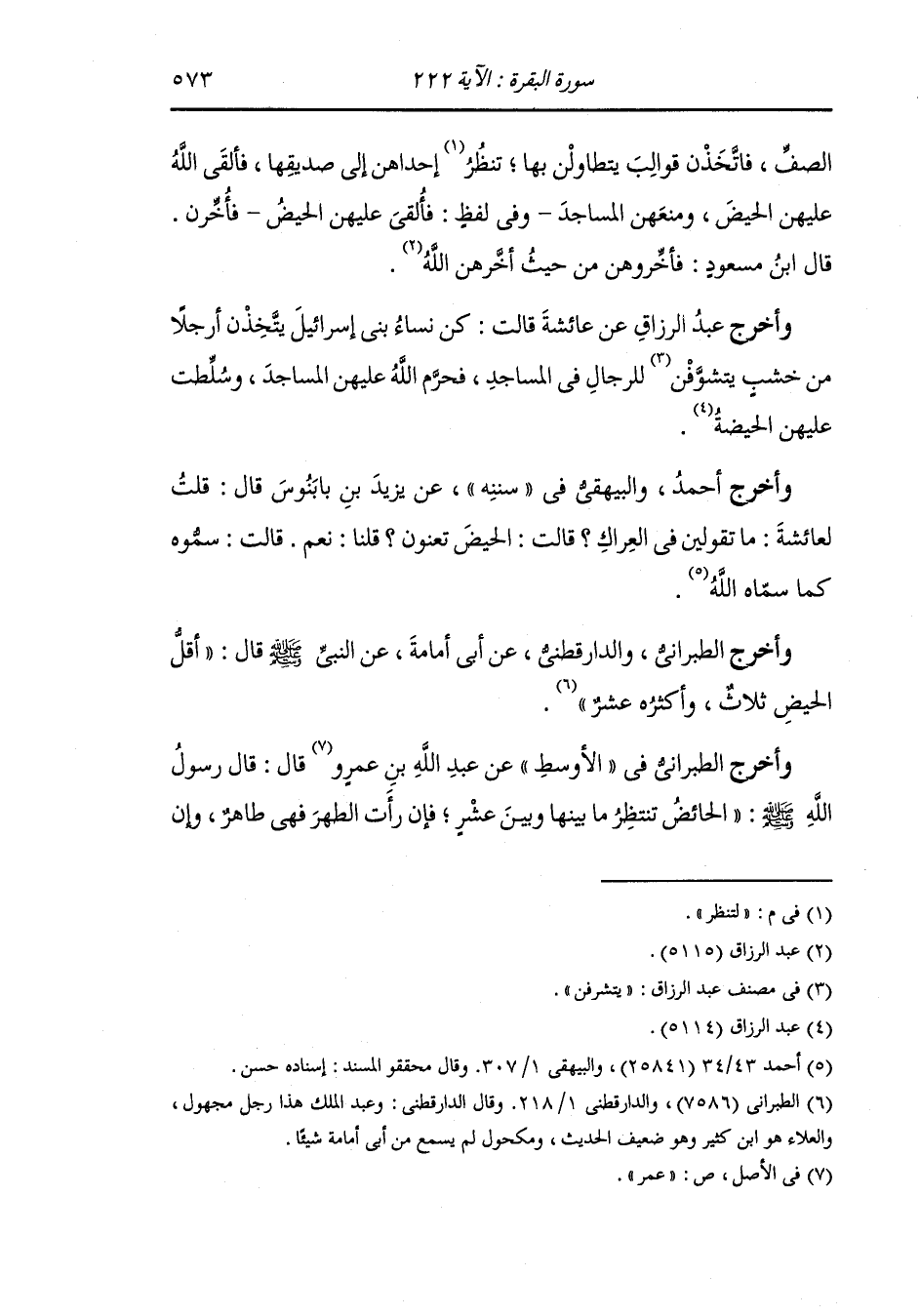 وأخرج أحمد والبيهقي في "سُنَنِه" عن يزيد بن بابنوس قال : قلت لعائشة : ما تقولين في العراك قالت الحيض تعنون قلنا : نعم ، قالت : سموه كما سماه الله.