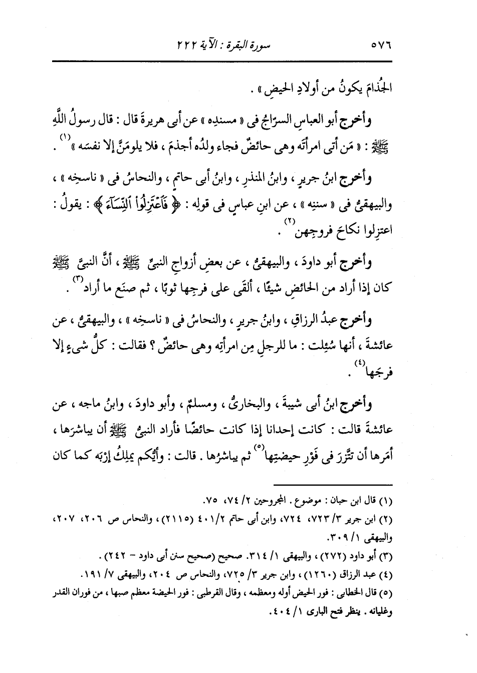 وأخرج عبد الرزاق ، وَابن جَرِير والنحاس في ناسخه والبيهقي عن عائشة أنها سئلت ما للرجل من امرأته وهي حائض فقالت : كل شيء إلا فرجها.