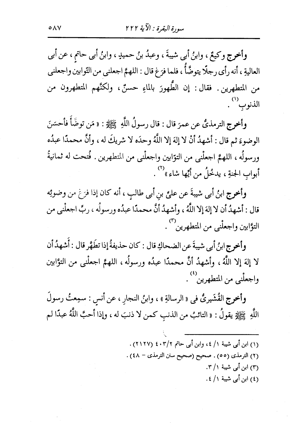 وأخرج ابن أبي شيبة عن الضحاك قال : كان حذيفة إذا تطهر قال : أشهد أن لا إله إلا الله وأشهد أن محمدا عبده ورسوله اللهم اجعلني من التوابين واجعلني من المتطهرين.