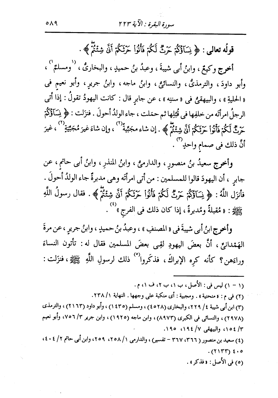 أخرج وكيع ، وَابن أبي شيبة ، وعَبد بن حُمَيد والبخاري وأبو داود والترمذي والنسائي ، وَابن ماجة ، وَابن جَرِير وأبو نعيم في الحلية والبيهقي في "سُنَنِه" قال : كانت اليهود تقول : إذا أتى الرجل امرأته من خلفها في قبلها ثم حملت جاء الولد