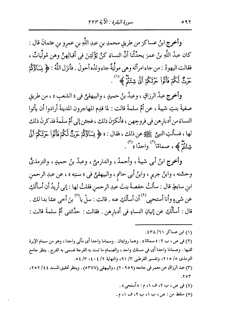 وأخرج عبد الرزاق ، وعَبد بن حُمَيد والبيهقي في الشعب من طريق صفية بنت شيبة عن أم سلمة قالت لما قدم المهاجرون المدينة أرادوا أن يأتوا النساء من أدبارهن في فروجهن فأنكرن ذلك فجئن أم سلمة فذكرن ذلك لها فسألت النَّبِيّ صلى الله عليه وسلم عن ذلك فقال {نساؤكم حرث لكم فأتوا حرثكم أنى شئتم} صماما واحدا.