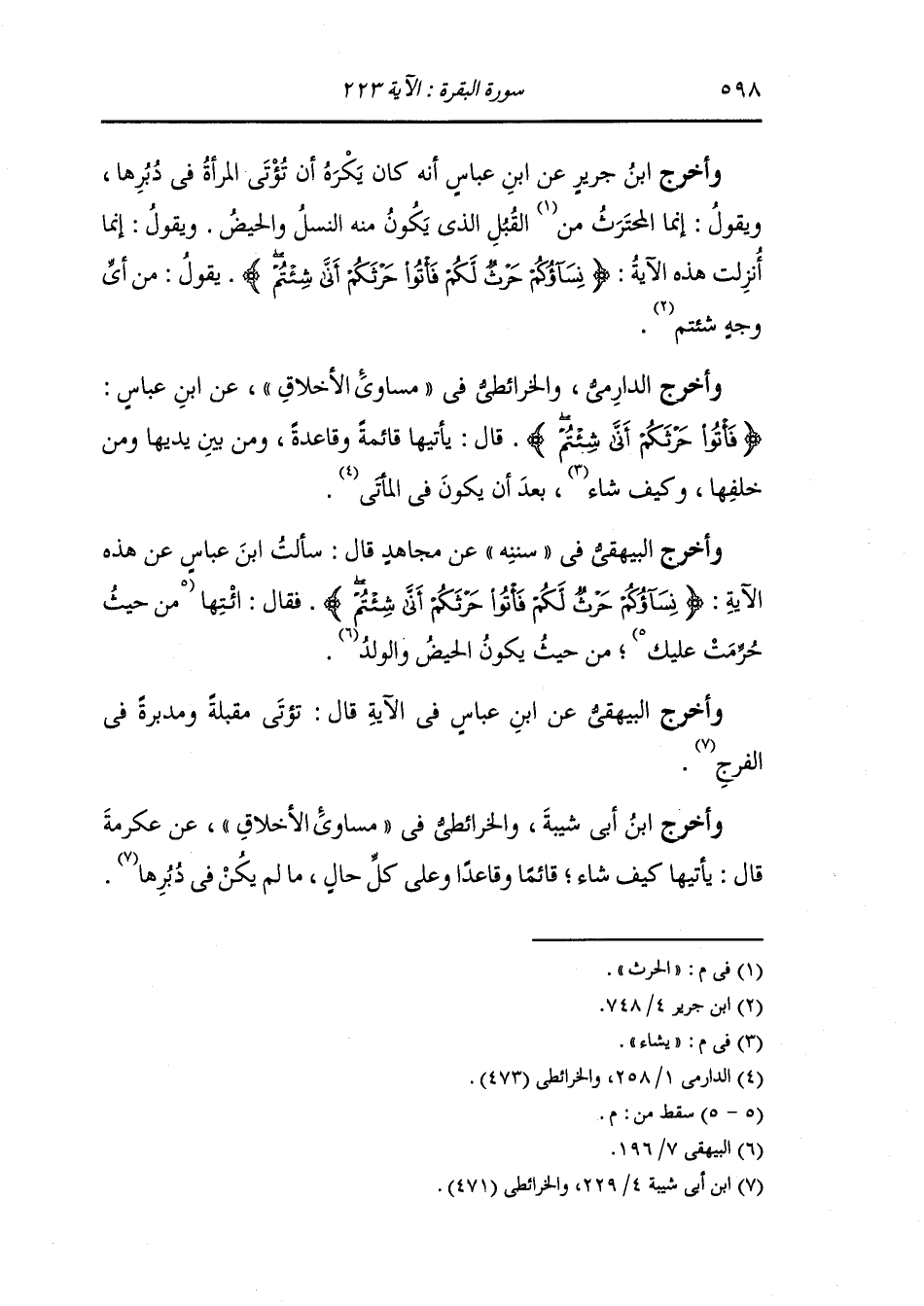 وأخرج البيهقي في "سُنَنِه" عن مجاهد قال : سألت ابن عباس عن هذه الآية {نساؤكم حرث لكم فأتوا حرثكم أنى شئتم} فقال : ائتها من حيث يكون الحيض والولد.