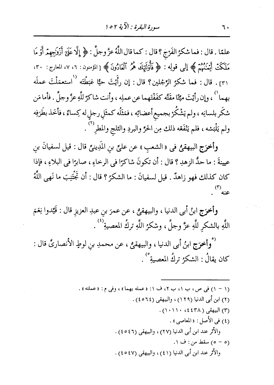 وأخرج ابن أبي الدنيا والبيهقي عن أبي حازم أن رجلا قال له : ما شكر العينين قال : إن رأيت بهما خيرا أعلنته وإن رأيت بهما شرا سترته ، قال : فما شكر الأذنين قال : إن سمعت خيرا وعيته وإن سمعت بهما شرا أخفيته ، قال : فما شكر اليدين قال : لا تأخذ بهما ما ليس لهما ولا تمنع حقا لله عز وجل هو فيهما ، قال : فما شكر البطن قال : أن يكون أسفله طعاما وأعلاه