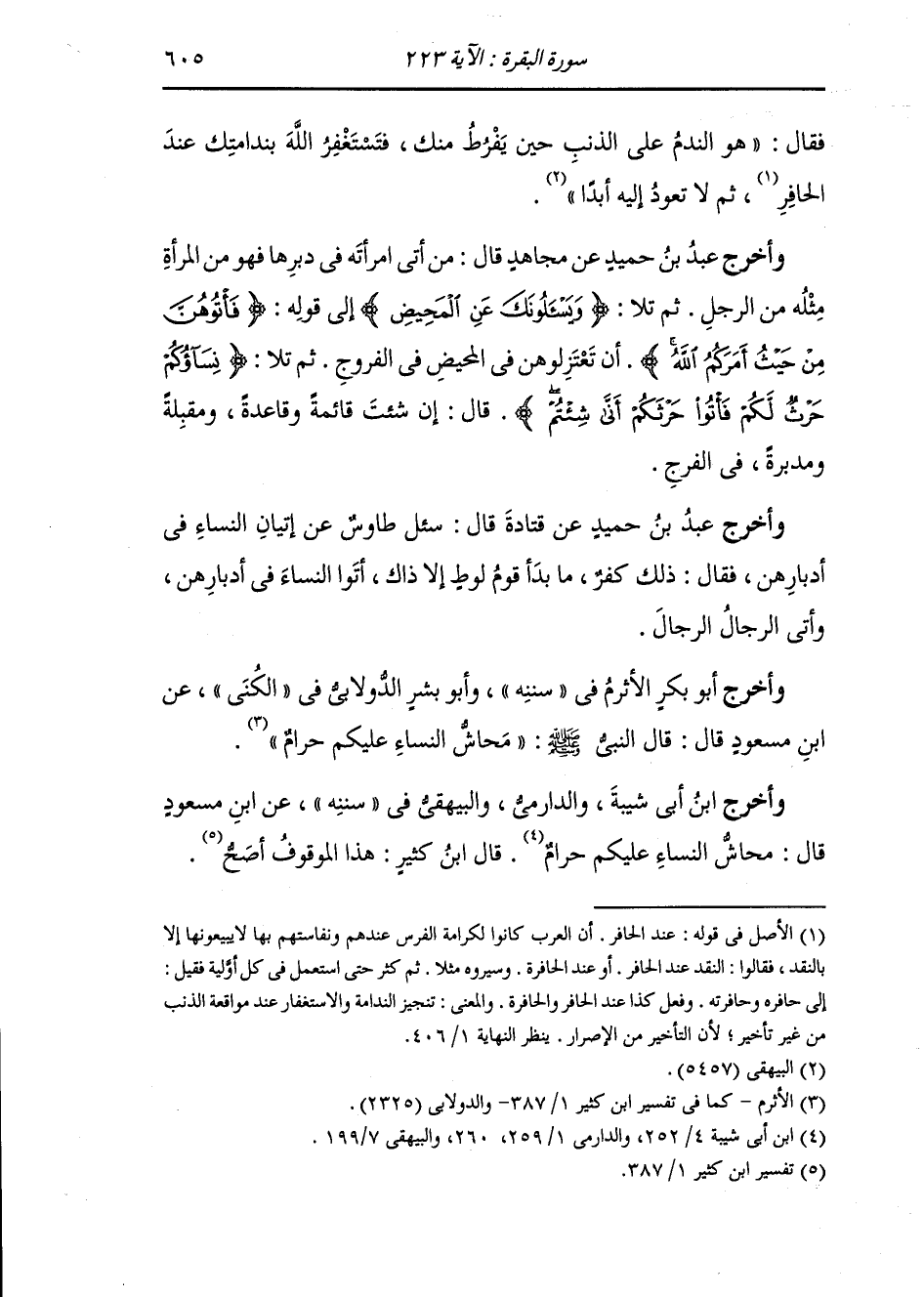 وأخرج عَبد بن حُمَيد عن قتادة قال : سئل طاووس عن إتيان النساء في أدبارهن فقال : ذلك كفر ما بدأ قوم لوط إلا ذاك أتوا النساء في أدبارهن وأتى الرجال الرجال.