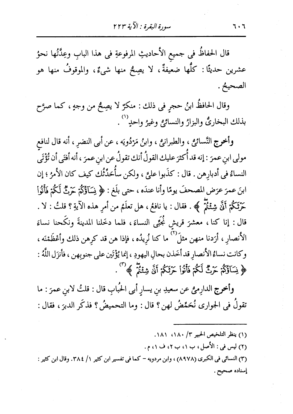 وأخرج النسائي والطبراني ، وَابن مردويه عن أبي النضر ، أنه قال لنافع مولى ابن عمر : أنه قد أكثر عليك القول أنك تقول عن ابن عمر : أنه أفتى أن يؤتى النساء في أدبارهن قال : كذبوا علي ولكن سأحدثك كيف كان الأمر : إن ابن عمر عرض المصحف يوما وأنا عنده حتى بلغ {نساؤكم حرث لكم فأتوا حرثكم أنى شئتم} فقال : يا نافع هل تعلم من أمر هذه الآية قلت : لا ، قال : إنا كنا معشر قريش نجبي النساء فلما دخلنا المدينة ونكحنا نساء الأنصار أردنا منهن ما كنا نريد فإذا هن قد كرهن ذلك وأعظمنه وكانت نساء الأنصار قد أخذت بحال اليهود إنما يؤتين على جنوبهن فأنزل الله {نساؤكم حرث لكم فأتوا حرثكم أنى شئتم}.
