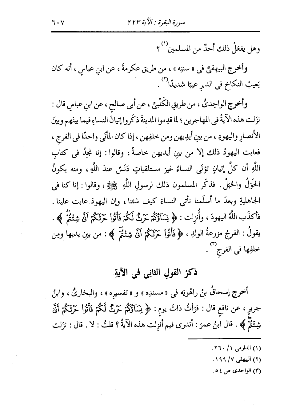 وأخرج الواحدي من طريق الكلبي عن أبي صالح عن ابن عباس قال نزلت هذه الآية في المهاجرين لما قدموا المدينة ذكروا إتيان النساء فيما بينهم وبين الأنصار واليهود من بين أيديهن ومن خلفهن إذا كان المأتى واحدا في الفرج فعابت اليهود ذلك إلا من بين أيديهن خاصة وقالوا : إنا نجد في كتاب الله أن كل إتيان النساء غير مستلقيات دنس عند الله ومنه يكون الحول والخبل فذكر المسلمون ذلك لرسول الله صلى الله عليه وسلم وقالوا : إنا كنا في الجاهلية وبعدما أسلمنا نأتي النساء كيف شئنا وإن اليهود عابت علينا فأكذب الله اليهود ونزلت {نساؤكم حرث لكم فأتوا حرثكم أنى شئتم} يقول : الفرج مزرعة الولد فأتوا حرثكم أتى شئتم من بين يديها ومن خلفها في الفرج ، ذكر القول الثاني في الآية.