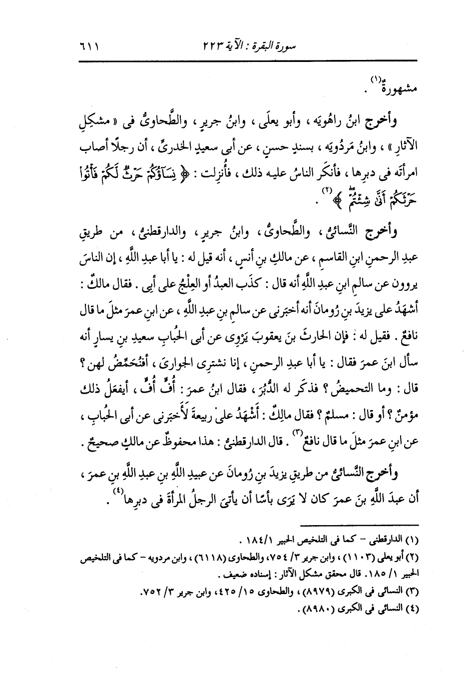 وأخرج النسائي والطحاوي ، وَابن جَرِير والدارقطني من طريق عبد الرحمن بن القاسم عن مالك بن أنس ، أنه قيل له : يا أبا عبد الله إن الناس يروون عن سالم بن عبد الله أنه قال : كذب العبد أو العلج على أبي ، فقال مالك : أشهد على يزيد بن رومان أنه أخبرني عن سالم بن عبد الله عن ابن عمر مثل ما قال لنافع ، فقيل له : فإن الحارث بن يعقوب يروي عن أبي الحباب سعيد بن يسار أنه سأل ابن عمر فقال : يا أبا عبد الرحمن إنا نشتري الجواري أفنحمض لهن قال : وما التحميض فذكر له الدبر ، فقال ابن عمر : أف أف أيفعل ذلك مؤمن ، أو قال : مسلم ، فقال مالك : أشهد على ربيعة أخبرني عن أبي الحباب عن ابن عمر مثل ما قال نافع ، قال الدارقطني : هذا محفوظ عن مالك صحيح.