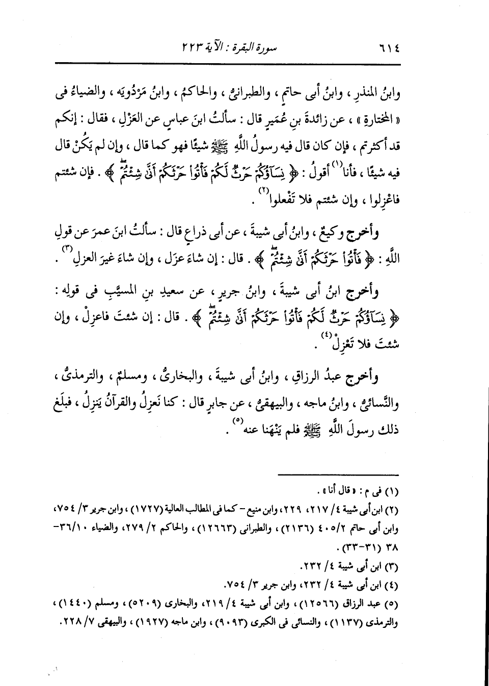 وابن أبي حاتم والطبراني والحاكم ، وَابن مردويه والضياء في المختارة عن زائدة بن عمير قال : سألت ابن عباس عن العزل فقال : إنكم قد أكثرتم فإن كان قال فيه رسول الله صلى الله عليه وسلم شيئا فهو كما قال وإن لم يكن قال فيه شيئا قال : أنا أقول {نساؤكم حرث لكم فأتوا حرثكم أنى شئتم} فإن شئتم فاعزلوا وإن شئتم فلا تفعلوا.