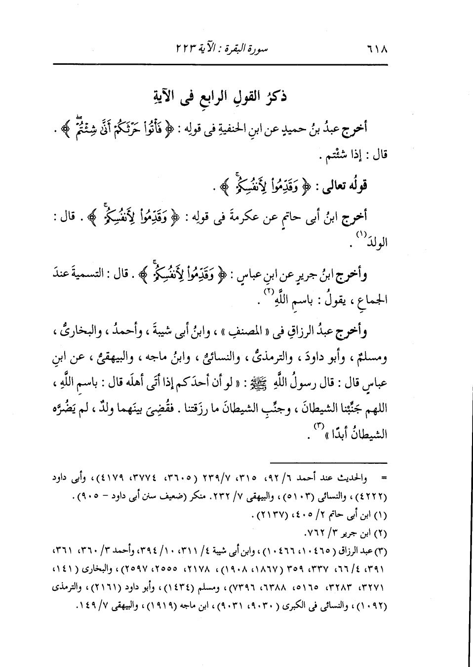 وأخرج ابن جرير عن ابن عباس {وقدموا لأنفسكم} قال : التسمية عند الجماع يقول : بسم الله.