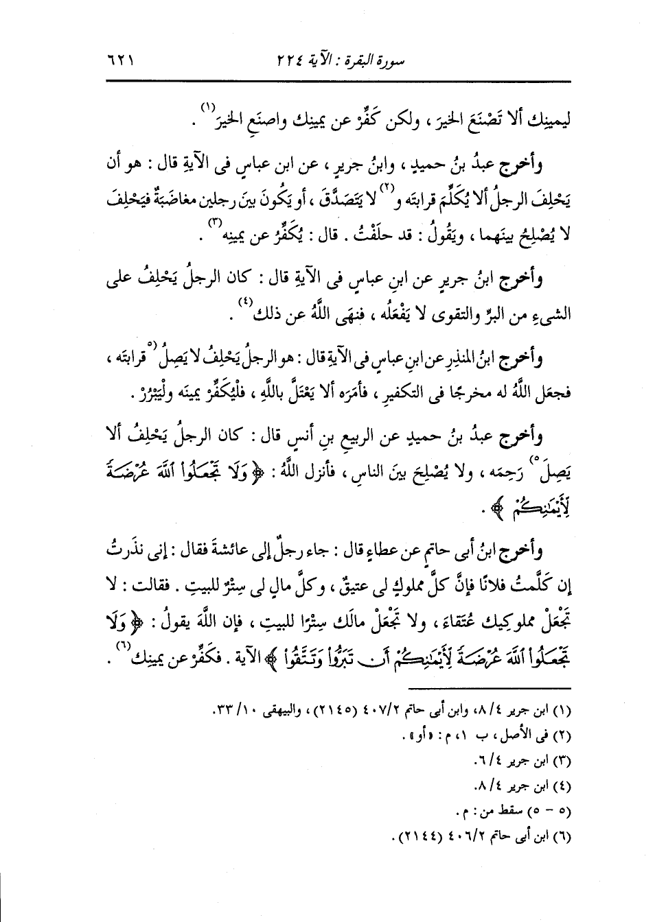 وأخرج عَبد بن حُمَيد ، وَابن جَرِير عن ابن عباس في الآية قال : هو أن يحلف الرجل أن لا يكلم قرابته أو لا يتصدق أو يكون بين رجلين مغاضبة فيحلف لا يصلح بينهما ويقول قد حلفت ، قال : يكفر عن يمينه.