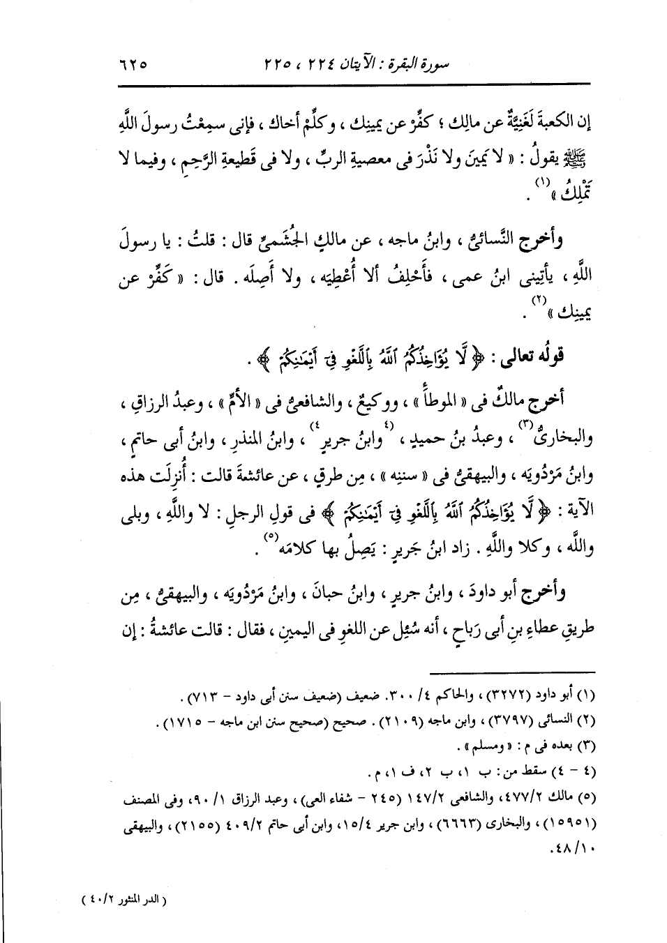 أخرج مالك في الموطأ ووكيع والشافعي في الأم وعبد الرزاق والبخاري ومسلم ، وعَبد بن حُمَيد ، وَابن المنذر ، وَابن أبي حاتم ، وَابن مردويه والبيهقي في "سُنَنِه" من طرق عن عائشة قالت : أنزلت هذه الآية {لا يؤاخذكم الله باللغو في أيمانكم} في قول الرجل : لا والله وبلى والله وكلا والله زاد ابن جرير : يصل بها كلامه.