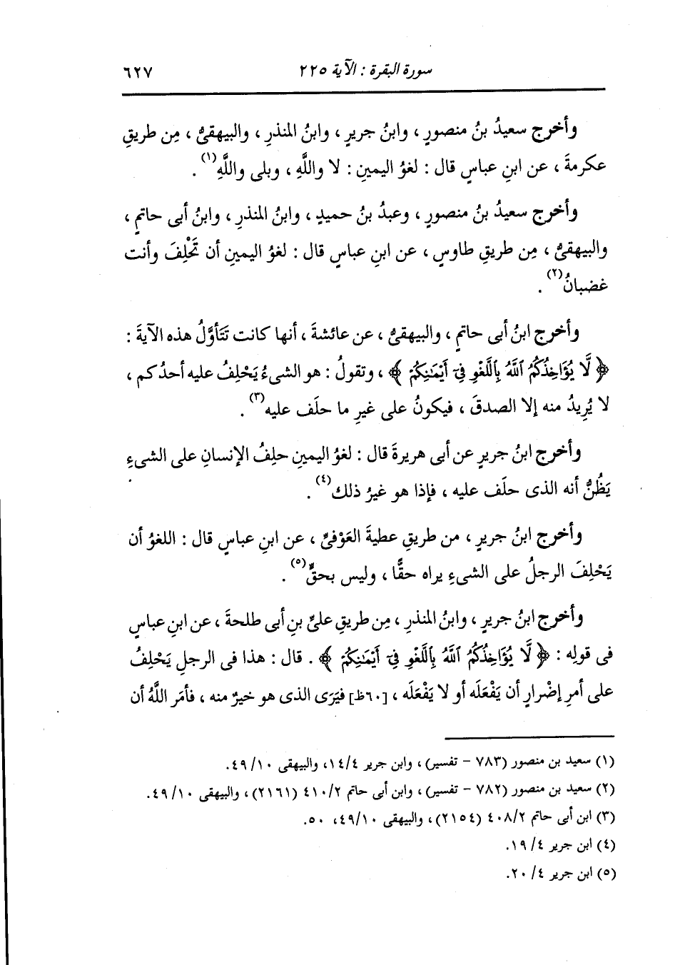 وأخرج سعيد بن منصور ، وَابن جَرِير ، وَابن المنذر والبيهقي من طريق عكرمة عن ابن عباس قال : لغو اليمين لا والله وبلى والله.