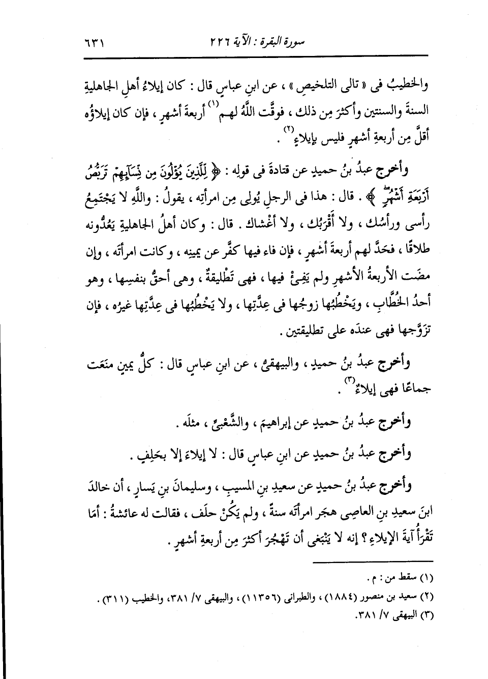 والخطيب في تالي التلخيص عن ابن عباس قال : كان إيلاء أهل الجاهلية السنة والسنتين وأكثر من ذلك فوقت الله أربعة أشهر فإن كان إيلاؤه أقل من أربعة أشهر فليس بإيلاء.