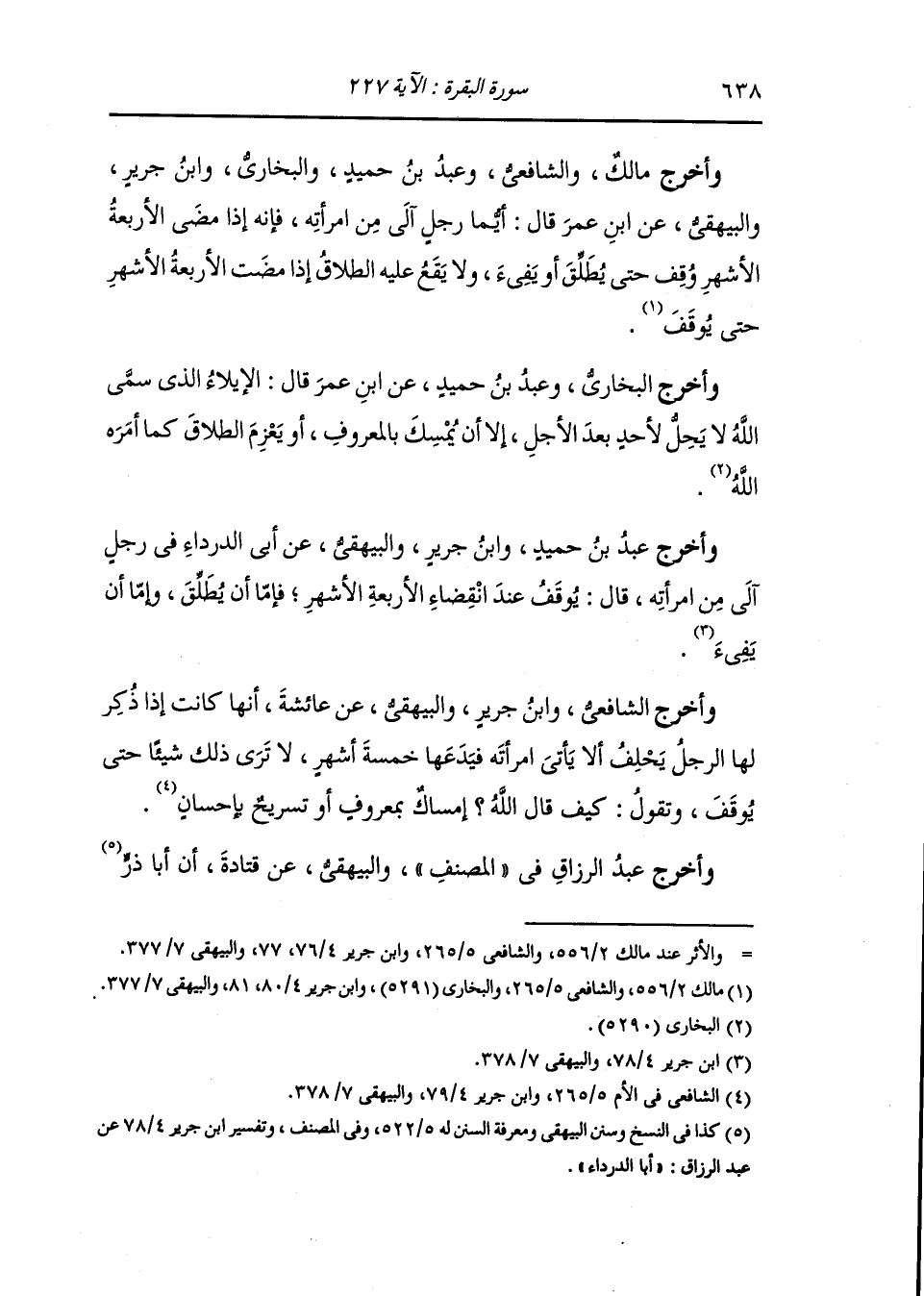وأخرج مالك والشافعي ، وعَبد بن حُمَيد والبخاري ، وَابن جَرِير والبيهقي عن ابن عمر قال أيما رجل آلى من امرأته فإن إذا مضى الأربعة أشهر وقف حتى يطلق أو يفيء ولا يقع عليه الطلاق إذا مضت الأربعة أشهر حتى يوقف.