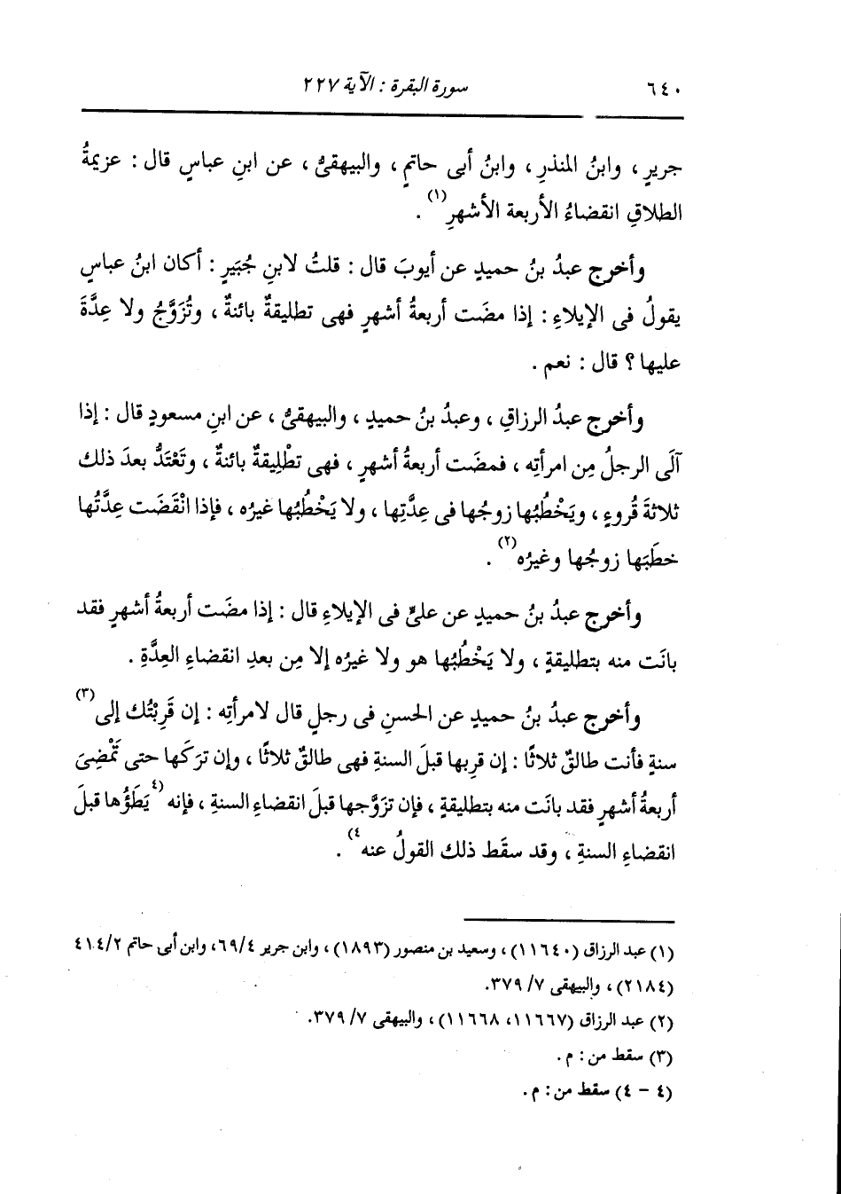 جرير ، وَابن المنذر ، وَابن أبي حاتم والبيهقي عن ابن عباس قال عزيمة الطلاق إنقضاء أربعة أشهر.