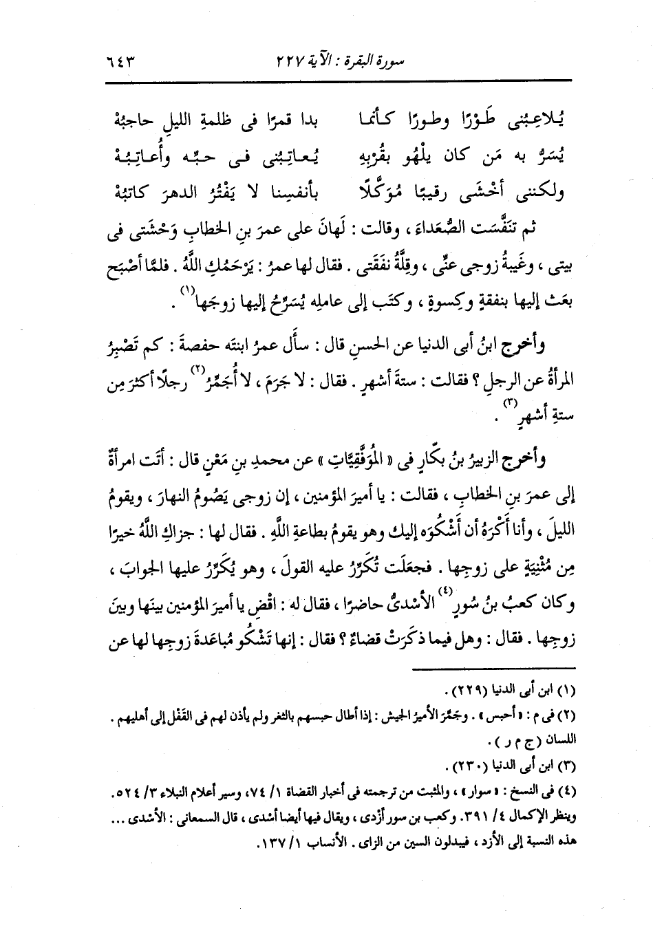 وأخرج الزبير بن بكار في الموفقيات عن محمد بن معن قال : أتت امرأة إلى عمر بن الخطاب فقالت : يا أمير المؤمنين إن زوجي يصوم النهار ويقوم الليل وأنا أكره أن أشكوه إليك وهو يقوم بطاعة الله ، فقال لها : جزاك الله خيرا من مثنية على زوجها ، فجعلت تكرر عليه القول وهو يكرر عليها الجواب وكان كعب بن سوار الأسدي حاضرا فقال له : اقض يا أمير المؤمنين بينها وبين زوجها ، فقال : وهل فيما ذكرت قضاء فقال : إنها تشكو مباعدة زوجها لها عن