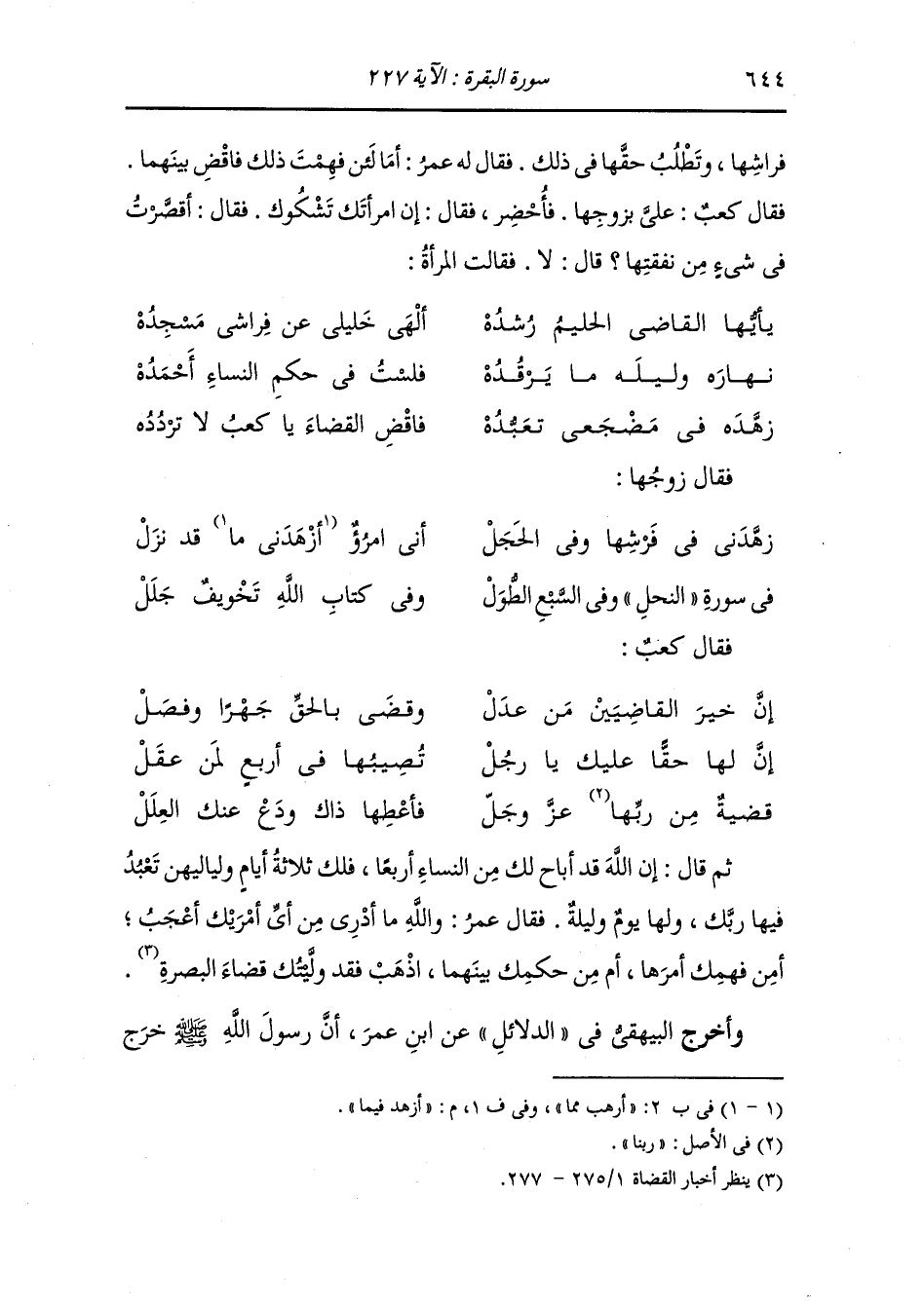 فراشها وتطلب حقها في ذلك ، فقال له عمر : أما لأن فهمت ذلك فأقض بينهما ، فقال كعب : علي بزوجها فأحضر فقال : إن إمرأتك تشكوك ، فقال : قصرت في شيء من نفقتها قال : لا ، فقالت المرأة : يا أيها القاضي الحكيم برشده * ألهى خليلي عن فراشي مسجده نهاره وليله ما يرقده * فلست في حكم النساء أحمده زهده في مضجعي تعبده * فاقض القضا يا كعب لا تردده