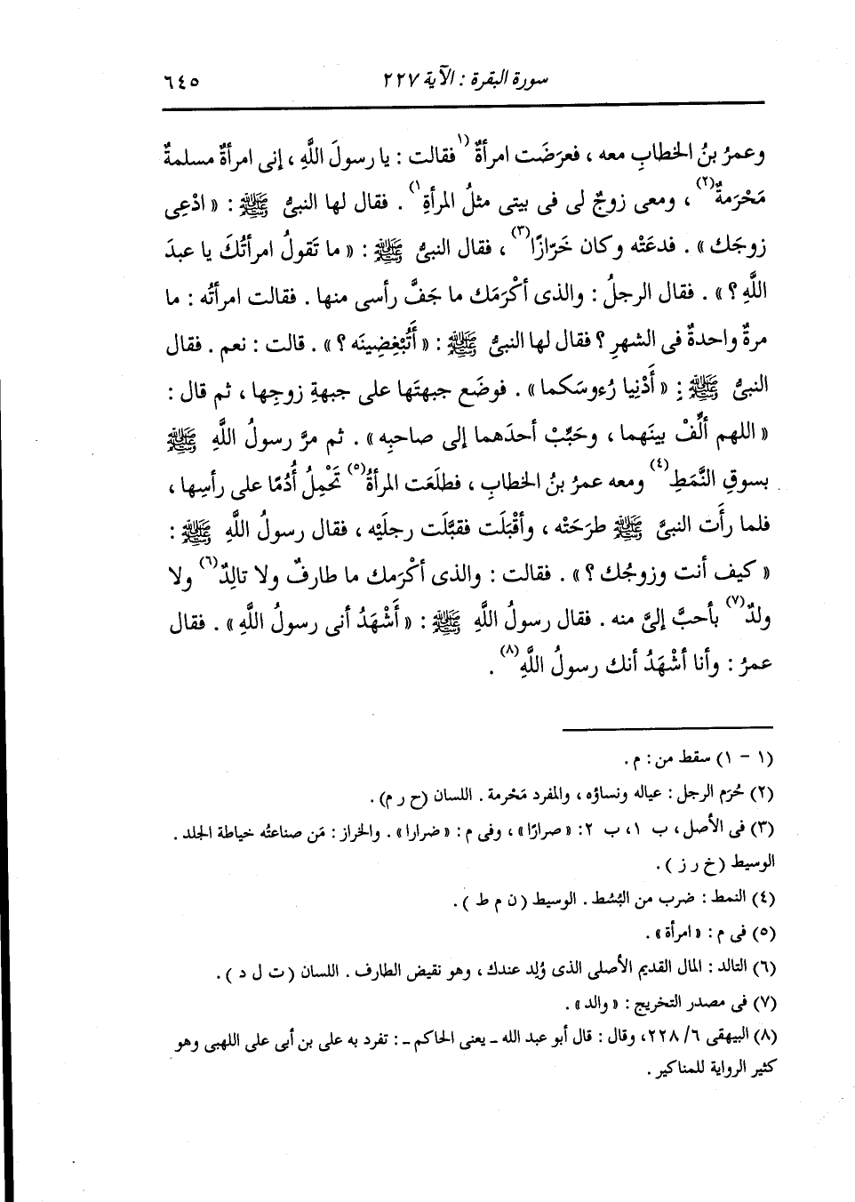 وعمر بن الخطاب معه فعرضت امرأة فقال لها النَّبِيّ صلى الله عليه وسلم : ادعي زوجك فدعته وكان ضرارا فقال النَّبِيّ صلى الله عليه وسلم : ما تقول إمرأتك يا عبد الله فقال الرجل : والذي أكرمك ما جف رأسي منها ، فقالت امرأته : ما مرة واحدة في الشهر ، فقال لها النَّبِيّ صلى الله عليه وسلم : أتبغضيه قالت : نعم ، فقال النَّبِيّ صلى الله عليه وسلم : ادنيا رأسيكما فوضع جبهتها على جبهة زوجها ثم قال : اللهم ألف بينهما وحبب أحدهما إلى صاحبه ثم مر رسول الله بسوق النمط ومعه عمر بن الخطاب فطلعت امرأة تحمل إدما على رأسها فلما رأت النَّبِيّ طرحته وأقبلت فقبلت رجليه فقال رسول الله : كيف أنت وزوجك فقالت : والذي أكرمك ما طارف ولا تالد ولا ولد بأحب إلي منه ، فقال رسول الله صلى الله عليه وسلم : أشهد أني رسول الله ، فقال عمر : وأنا أشهد أنك رسول الله